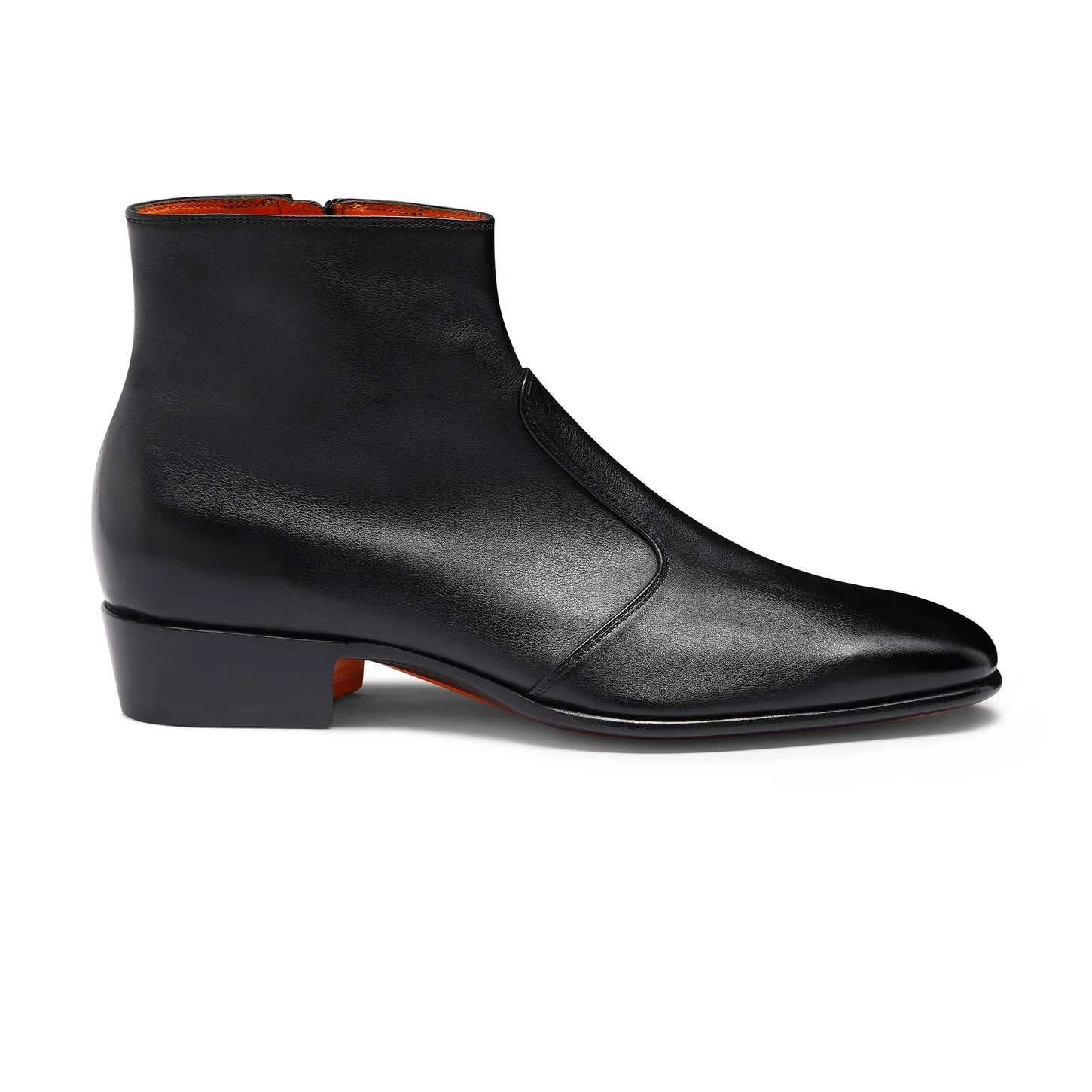 For everyday looks that strike the perfect balance between refined and edgy, look no further than this men's ankle boot. Its sleek silhouette is crafted from smooth leather, elevated with a contrast leather sole in Santoni's iconic orange tone. Styled with a tapered toe, slender ankle and inner side zip closure. Product details Product ID: MCAD18881BA2GMEMN01 - Men’s ankle boot - Crafted from leather - Color: black - Inner side zip - Leather sole with half rubber heel - Printed Santoni logo on the insole - Made in Italy