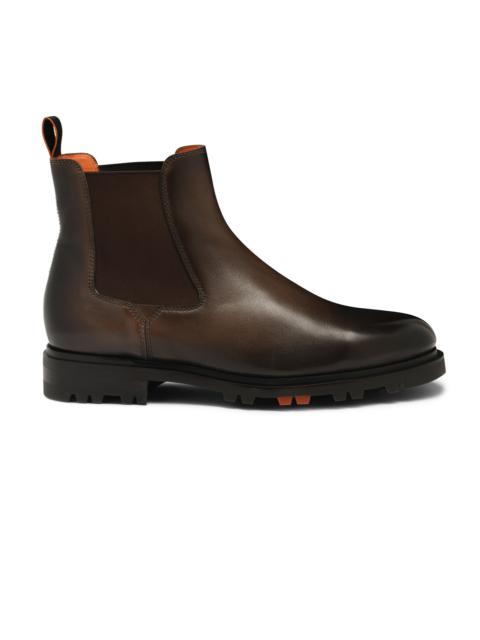 Effortless style for life in the fast lane. This Chelsea boot is crafted from luxurious leather, treated with our iconic “velatura” coloring technique for a unique gradated effect. Elasticated side inserts and a rear pull tab make it quick and easy to slip on and off, whilst a double-buckle-inspired detail on the tread in signature Santoni orange marks every stride with unmistakable charm. Designed with a Goodyear welt construction for an exceptionally soft, flexible feel. Product details Product ID: MCCO17748SM3GGKRN01 - Men’s Chelsea boot - Crafted from leather - Color: black - Elasticated side inserts - Logo tape pull tab - Flexible Goodyear welt construction - Rubber sole - Orange double-buckle-inspired detail - Printed Santoni logo on the insole - Made in Italy