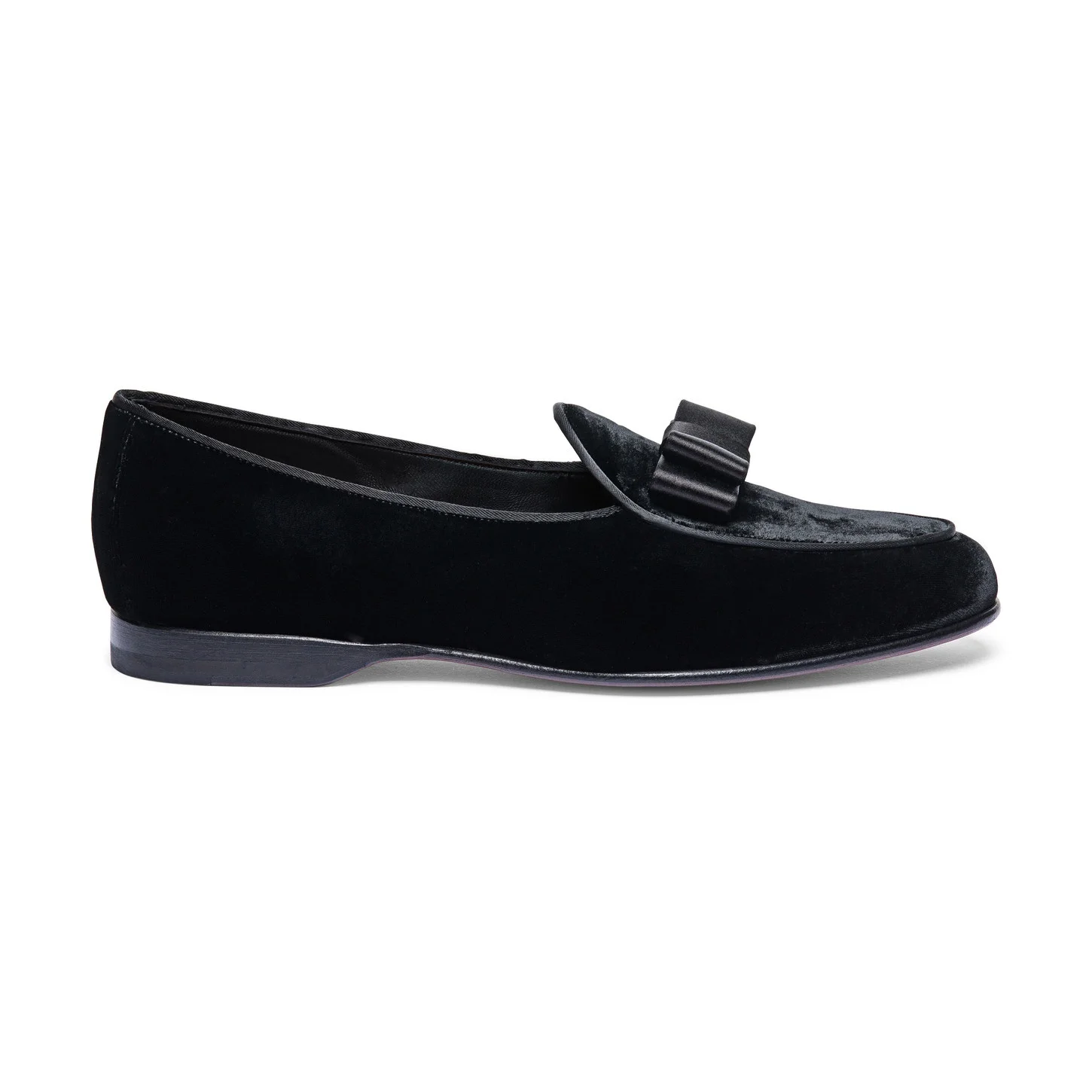 A reinterpretation of an archival classic, the Andrea loafer is a seamless fusion of formal allure and lightweight modern comfort. This iteration presents the sleek, low-cut silhouette in soft velvet, bringing refined personality to evening ensembles and special occasions. Styled with apron stitching and a sophisticated satin bow. Product details Product ID: MCAN19149LA1FSBWN01 - Crafted from velvet - Color: black - Satin bow - Apron stitching - Classic silhouette with tapered toe - Leather sole with half rubber heel - Printed Santoni logo on the insole - Made in Le Marche, Italy