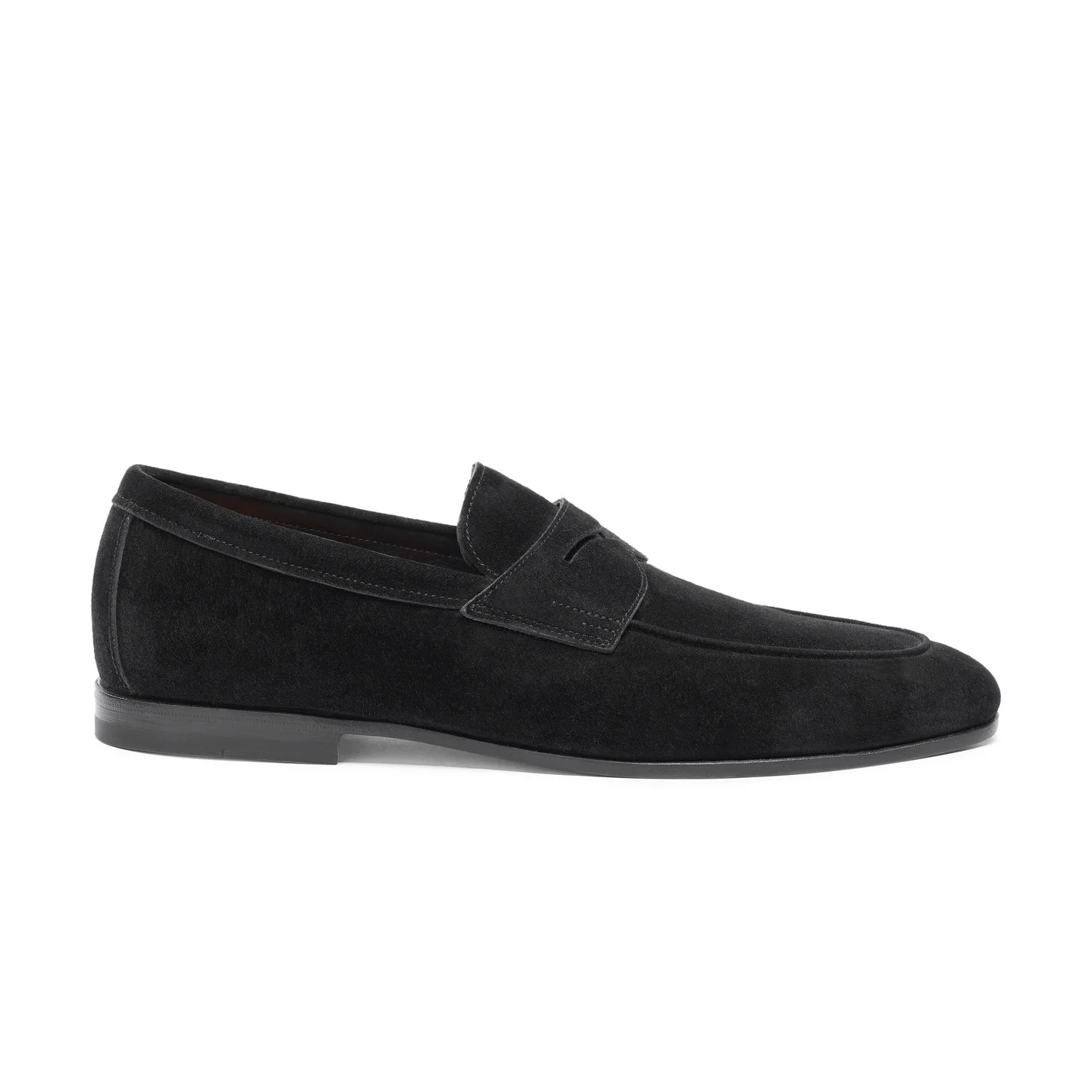 Elevate your everyday wardrobe with this suede loafer, adding a refined update to office-to-evening looks. This style flaunts an elegant silhouette with a classic saddle strap and raised apron stitching to accentuate its timeless lines. A contrast orange sole marks every stride with signature Santoni allure, whilst its Goodyear welt construction makes for a soft, flexible feel. Product details Product ID: MCNC18837SA4SEAAN01 - Men's loafer - Crafted from suede - Colour: black - Raised apron stitching - Classic tapered silhouette - Goodyear welt construction - Leather sole with half rubber heel - Printed Santoni logo on the insole - Made in Italy