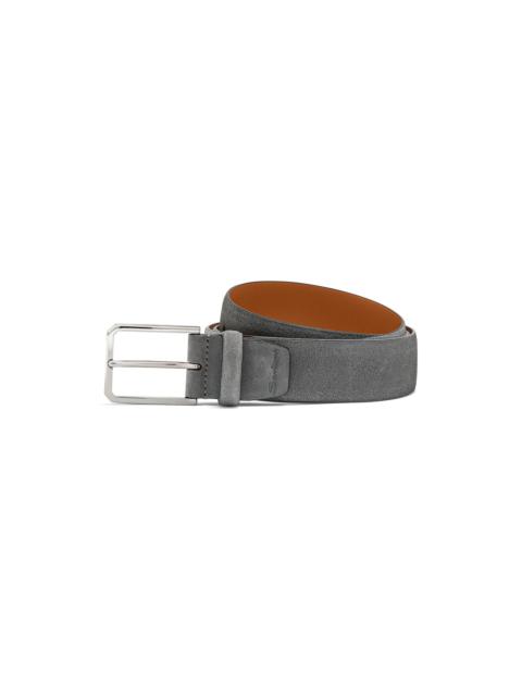 A sophisticated, versatile accessory dedicated to Santoni lovers with an eye for detail. This men's belt is crafted from luxurious suede with a contrast leather reverse in celebration of our signature orange tone. It can be adjusted and fastened using the elegant square metal buckle. Product details Product ID: CM35VS003B91E2MOU50 - Men’s belt - Crafted from suede - Colour: Blue - Adjustable - Width 3.5 cm - Square gold metal buckle - Suede loop - Made in Italy