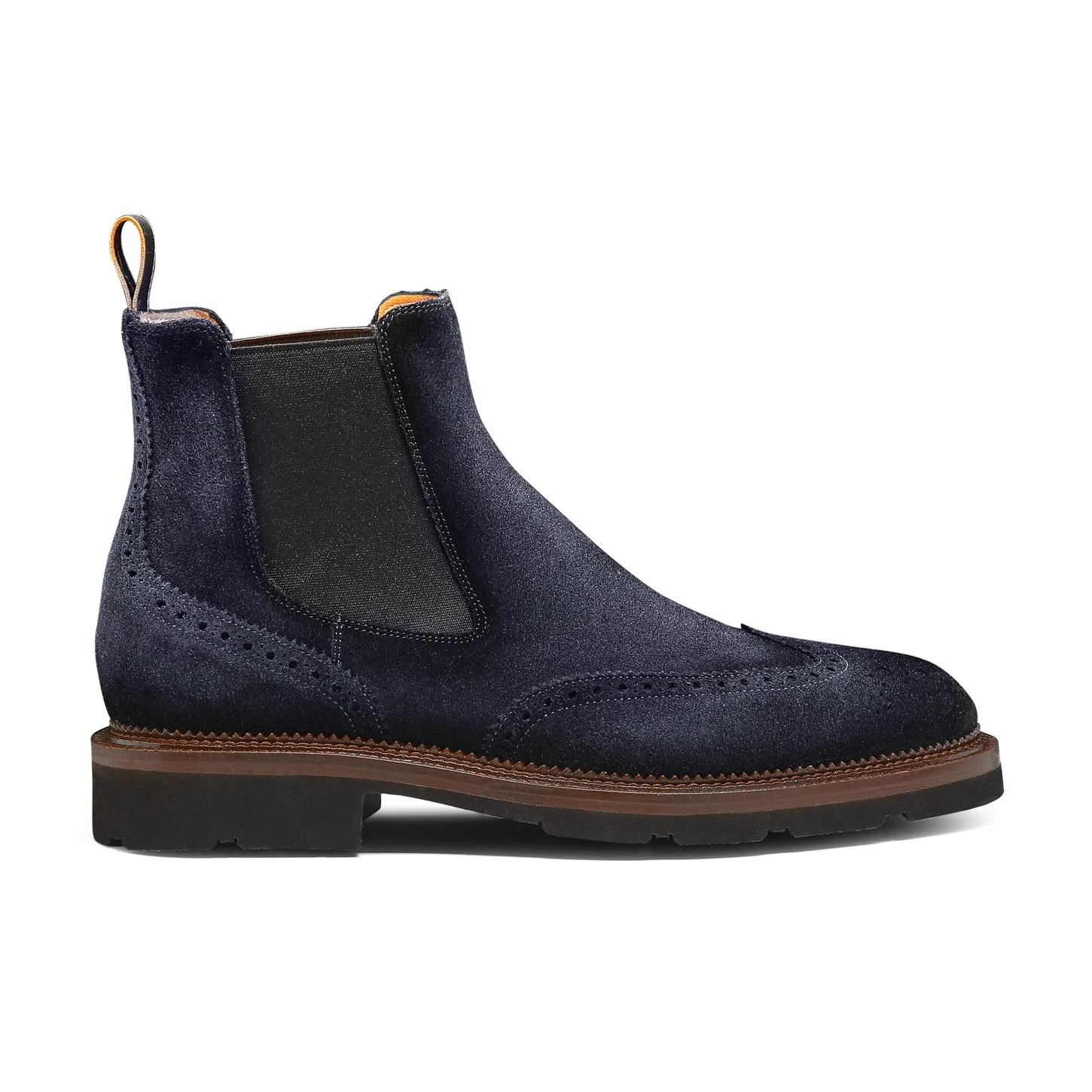 Classic elegance meets contemporary charm. Crafted from fine suede with quintessential brogue detailing, this Chelsea boot is characterised by elasticated side inserts and a rear pull tab that make slipping it on and off a breeze. But what truly sets this shoe apart is its structured yet lightweight construction, featuring a multi-layer sole with a leather welt and chunky rubber tread. Product details Product ID: MCCO19116JL4GRVRU59 - Crafted from suede - Color: blue - Brogue detailing - Rounded silhouette with tapered toe - Elasticated side inserts - Logo tape pull tab - Leather welt - Chunky rubber sole - Printed Santoni logo on the insole - Made in Le Marche, Italy