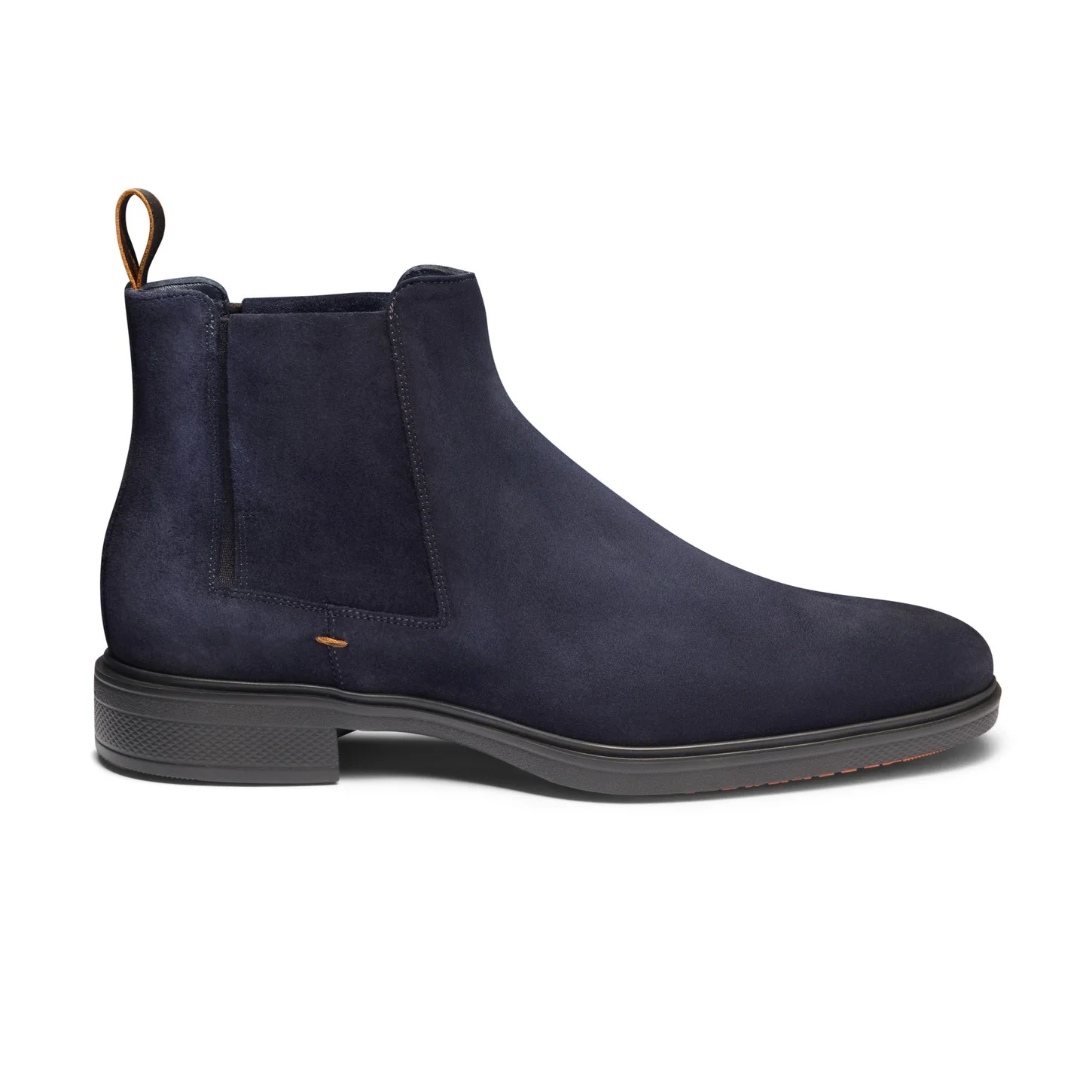 Strategically straddling artisanal craftsmanship and modern technology, this Chelsea boot from Santoni’s Easy collection strikes the perfect balance between style and practicality. This iteration stays true to the timeless design of the footwear icon, yet reinterprets it with an innovative flexible construction that weighs just 295g. Crafted from ultra-soft suede with our hallmark “velatura” gradated finish, it flaunts a perforated nappa lining, a memory foam insole and a rubber sole with unique Doubling design: a decorative pattern inspired by Santoni’s signature Double Buckle detail that simultaneously ensures optimal grip and durability. Product details Product ID: MGEO18937NEAXGEXU60 - Easy collection - Ultra-lightweight construction - Men’s Chelsea boot - Crafted from suede - Treated with Santoni’s “velatura” color-grading technique - Color: blue - Elasticated side inserts - Round toe - Logo tape pull tab - Perforated nappa lining - Memory foam insole - Orange rubber sole with double-buckle pattern - Printed Santoni logo on the insole - Made in Italy