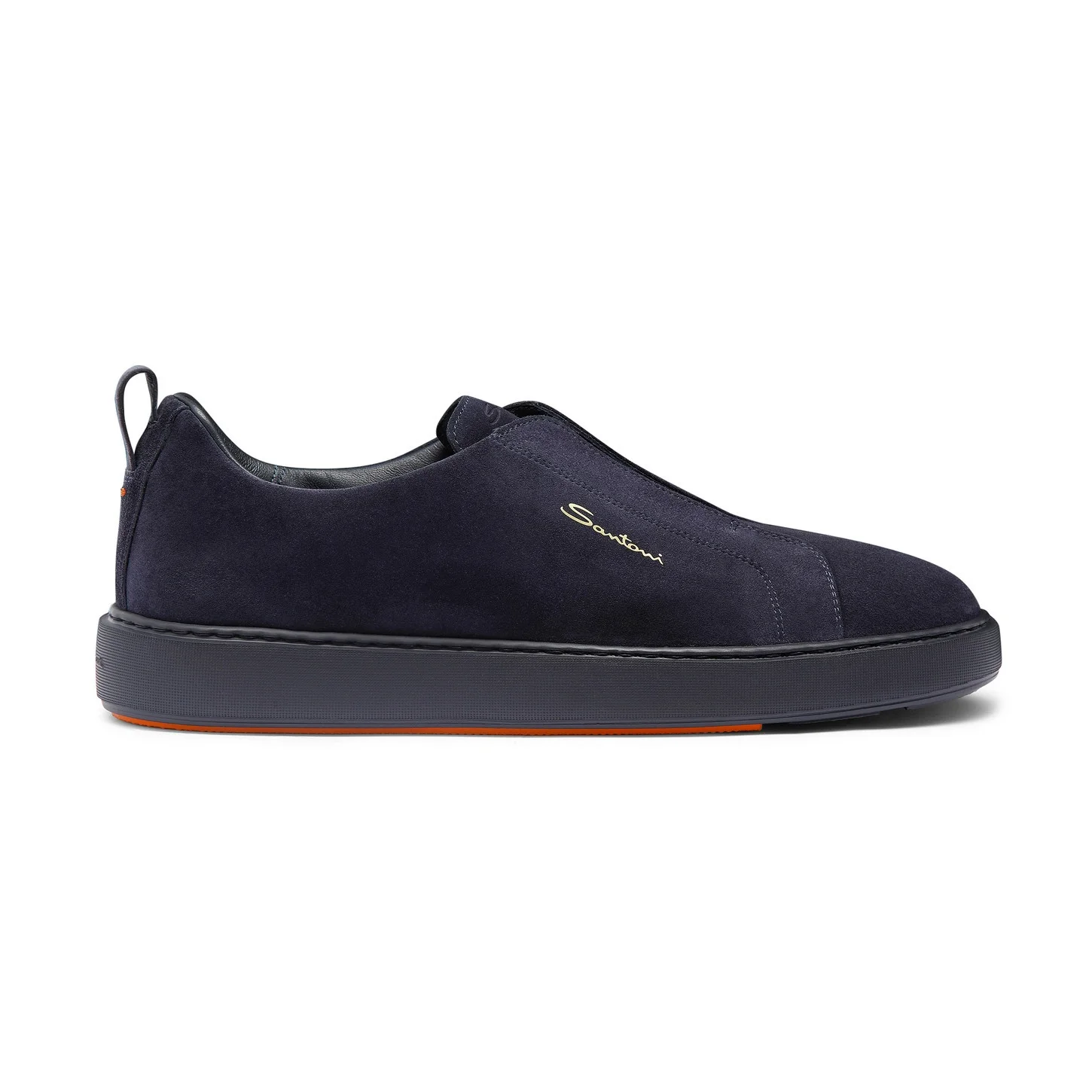 This men's suede slip-on sneaker features a tonal sole for a clean aesthetic that pairs with endless looks. Santoni's rich heritage shines through in every detail, from the logo print on the side to the decorative detail on the tread inspired by our iconic double-buckle shoe. A flexible rubber cupsole ensures maximum comfort from morning to night. Product details Product ID: MBCD21995OCATSEYU60 - Men's slip-on sneaker - Crafted from suede - Color: blue - Pull tab - Round toe - Tonal rubber cupsole - Orange double-buckle detail on the tread - Made in Italy