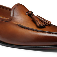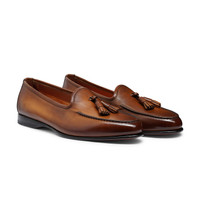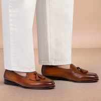 A refined style dedicated to those seeking lightweight elegance without compromising on luxurious materials and workmanship. Reinterpreting an archival classic, the Andrea loafer flaunts a sleek design with a low-cut silhouette that reveals the ankle, supported with a bevelled heel. Its soft nappa leather construction is enriched with our signature “velatura” colour-grading technique and embellished with delicate tassels to add movement to your stride. Designed with a special Goodyear welt construction for an ultra-soft, flexible feel. Product details Product ID: MCAN18515PA1SGFRM40 - Men's loafer - Crafted from nappa leather - Treated with Santoni’s “velatura” colour-grading technique - Colour: brown - Tassels - Raised apron stitching - Classic silhouette with tapered toe - Flexible Goodyear welt construction - Leather sole with half rubber heel - Printed Santoni logo on the insole - Made in Italy