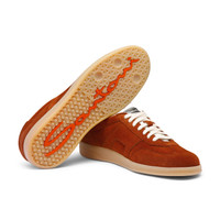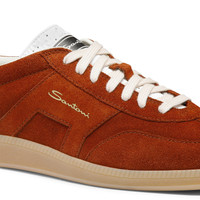 The new DBS Oly Sneaker flaunts a refined design with vintage undertones, recalling a Santoni archival classic. Crafted from plain suede, it features a unique side detail inspired by one of our signature codes—the double buckle—lifted from our formal shoe edit and transformed into a mark of modern style: a detail echoed on the contrast leather tongue in the form of an all-over raised motif. Complete with a slim natural-toned rubber sole to accentuate its retro charm. Product details Product ID: MBPL21975FARCEGCM59 - Men's low-top sneaker - Crafted from suede - Colour: brown - Double-buckle-inspired leather side detail - Subtle double-buckle detailing on the tongue - Lace-up fastening - Natural-tone rubber sole - Santoni lettering moulded into the tread - Made in Italy