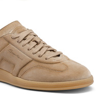 Vintage ‘70s tennis vibes, Santoni craftsmanship and contemporary charm make the DBS Oly the new marvel of your casual wardrobe. This men's style is made from lightly textured suede, hand-treated with our signature gradated finish. But what makes it really stand out from the rest is its thermoformed design: a unique pressing technique that emphasises the shoe’s iconic detailing. Product details Product ID: MBPL22072FARTSE2E50 - Crafted from suede - Thermoformed treatment - Color: light brown - Double-buckle-inspired side detail - Lace-up fastening - Tonal rubber cupsole - Santoni lettering moulded into the tread - Made in Le Marche, Italy