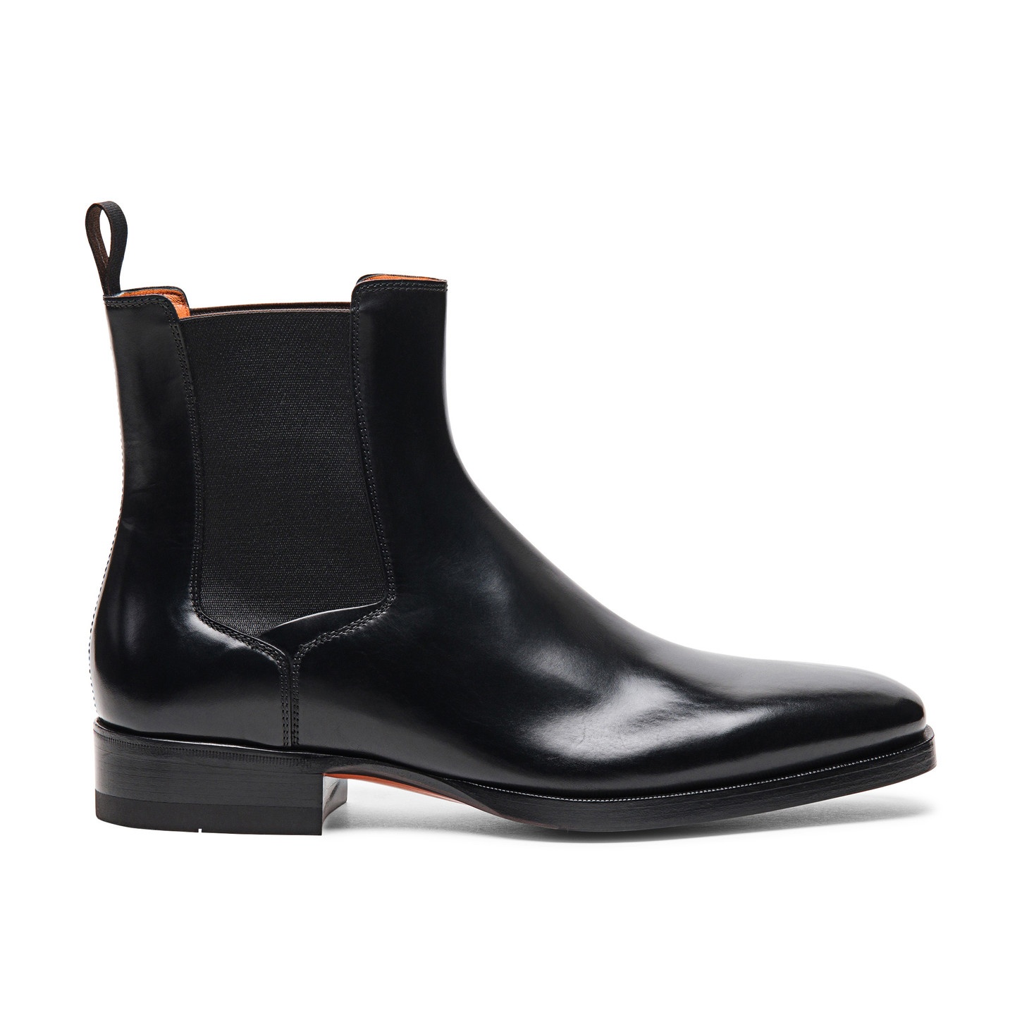 Elegant, comfortable and resistant: this Chelsea boot is a Santoni icon and a men’s wardrobe must-have. Its premium quality leather construction is characterised by a tapered silhouette with elasticated side inserts, finished with a pull tab that ensures it’s easy to slip on in a hurry. Product details Product ID: MCLE16755JH1IOBRN01 - Men’s Chelsea boot - Crafted from leather - Colour: black - Formal tapered silhouette with lightly squared off toe - Blake construction - Elasticated side inserts - Pull tab - Leather lining - Leather sole - Printed Santoni logo on the insole - Made in Italy