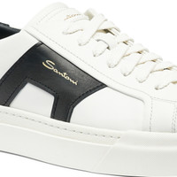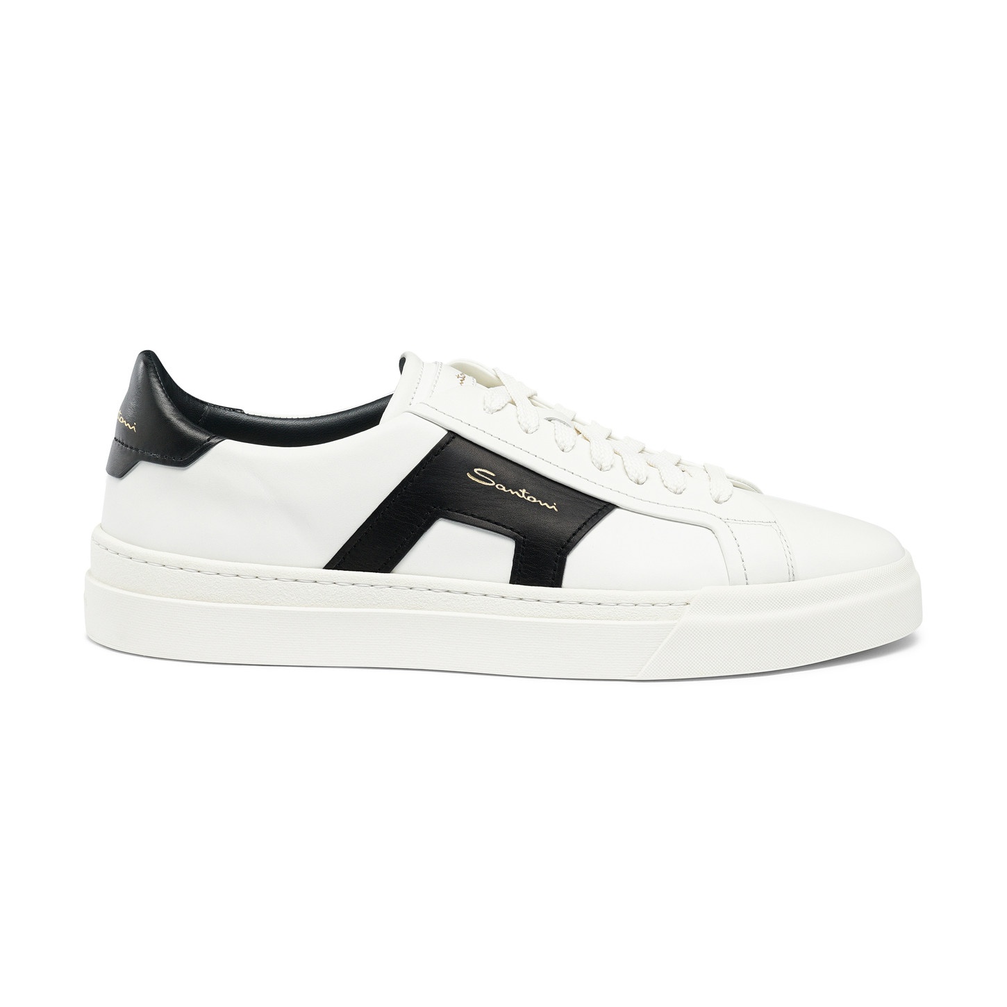 The Double Buckle Sneaker is a fusion of iconic Santoni codes. This style flaunts a sporty, supportive silhouette with a rubber cupsole that offers comfort and freedom of movement. Its premium-quality leather upper is enhanced with a double-buckle-shaped accent on the sides in hand-polished leather, paying homage to the brand’s artisanal heritage. Maxi lettering moulded into the tread completes the design, marking every stride with unmistakable style. Product details Product ID: MBGT21779PNNRBWEI10 - Men's low-top sneaker - Crafted from leather - Colour: white and black - Leather logo details on the tongue and heel - Double-buckle-inspired detail on the sides - Wide fit and round toe - Lace-up fastening - Rubber cupsole - Santoni lettering moulded into the tread - Made in Italy