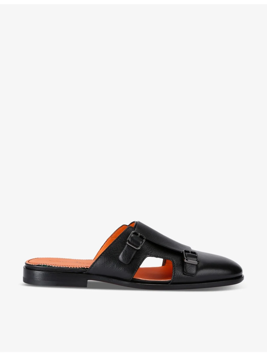 PRODUCT DETAILS - Santoni Monk double-buckle leather mules - 100% leather - Slips on - Almond closed toe, double-buckle detail, black-toned hardware, low block heel, cut-out detail - Specialist leather clean - Made in Italy - Upper: 100% leather - Lining: 100% leather - Sole: 100% leather Ref: R04236893