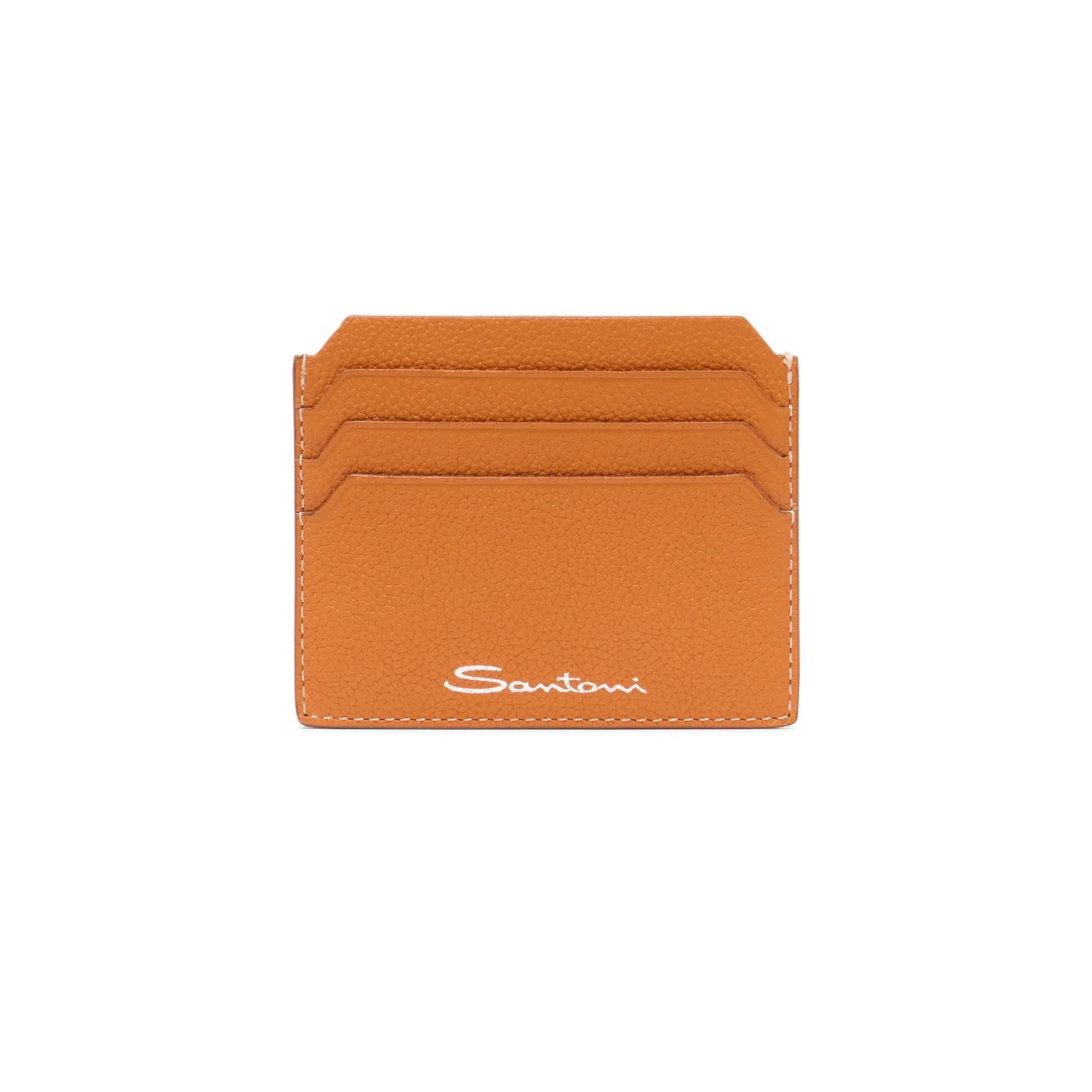 Fine tumbled leather and a sleek design for everyday functionality. This cardholder features a central pocket and three bevelled-edge slots on each side. Embellished with an embossed Santoni logo on the front for a signature touch. Product details Product ID: UFPPA2693FOASIWA33 - Crafted from tumbled leather - Color: orange - Central pocket - 3 card slots per side - Embossed Santoni logo on the front - Made in Le Marche, Italy