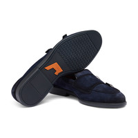Modern shapes and unexpected details express the timeless legacy of Santoni's mastery. This double-buckle shoe reinterprets the icon with a casual edge, crafted from reverse suede with a subtle texture and ultra-soft touch. A rubber sole ensures a comfortable stride, embellished with a nod to our signature double-buckle detail in Arancio Santoni orange. Product details Product ID: MGAR19006OOTSEAAU60 - Crafted from suede - Color: blue - Apron stitching - Double-buckle closure - Classic silhouette with round toe - Smooth rubber sole - Santoni Arancio orange double-buckle detail on the tread - Printed Santoni logo on the insole - Made in Le Marche, Italy