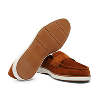 This Santoni loafer is dedicated to the modern man seeking exceptional quality and artisanal finesse, even for life’s off-duty moments. Flaunting a sleek, lightweight silhouette, this shoe is crafted from luxuriously soft suede, featuring raised apron stitching to accentuate its elegant lines. Its flexible rubber sole is enriched with a contrast midsole to match the colour of the upper. Product details Product ID: MGDT18657BIOSEGSC69 - Men's loafer - Crafted from suede - Colour: brown - Raised apron stitching - Classic saddle strap - Classic fit with round toe - Smooth rubber sole - Midsole matching the upper - Printed Santoni logo on the insole - Made in Italy