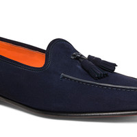 Archival influences, fresh hues and sleek lines rewrite the codes of the classic men’s loafer. This online exclusive reinterprets the spirit of the icon with a low-cut silhouette that leaves the ankle bare, finished with the style's signature stitched toe box and decorative tassels. Crafted from premium-quality suede, this shoe is designed with a special Goodyear welt construction to ensure an ultra-soft, flexible feel. Product details Product ID: MCAN18515PA1BSOVU75 - Online exclusive - Men's loafer - Crafted from suede - Color: blue - Tassels - Raised apron stitching - Classic silhouette with tapered toe - Goodyear welt construction - Leather sole with half rubber heel - Printed Santoni logo on the insole - Made in Italy