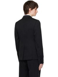 Wool gabardine blazer. · Metallic thread detailing at notched lapel · Single-button closure · Flap pockets · Darts at front and back · Padded shoulders · Four-button surgeon's cuffs · Central vent at back hem · Welt pockets at interior · Partial satin lining · Horn hardware Supplier color: Black/Silver Body 1: 100% wool. Body 2: 100% polyester. Lining: 100% cupro. Made in Italy 231968M195005