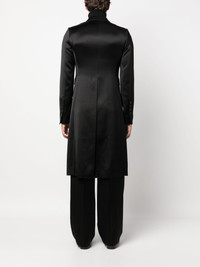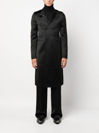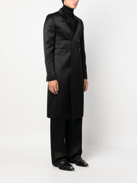 double-breasted satin-finish midi coat Highlights - Jet black - Fsc viscose - Satin finish - Cotton lining - Peak lapels - Double-breasted button fastening - Two front flap pockets - Long sleeves - Buttoned cuffs - American rear vent - Straight hem - Mid-calf length Made in Italy Composition Lining: Cupro 100%, Cotton 100% Outer: FSC Viscose 100% SIZE & FIT Model measurements Height 6 ft 2 in(1.88 m) Bust/Chest 37.79 in(96 cm) Hips 35.82 in(91 cm) Waist 29.92 in(76 cm) FittingInformation Designed for a slim fit, offering a comfortable fit that sits just away from the body The internal shoulder pads offer a structured shape Made from a midweight non-stretch fabric This piece fits true to size – take your usual size
