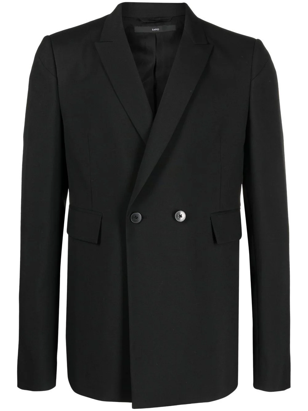 double-breasted tailored blazer jet black cotton-wool blend double-breasted button fastening long sleeves two side flap pockets tailored cut Made in Italy Composition Outer: Wool 100% Lining: Cupro 100%, Cotton 100% SIZE & FIT Model measurements Height 6 ft 2 in(1.88 m) Bust/Chest 36.61 in(93 cm) Hips 35.82 in(91 cm) Waist 27.95 in(71 cm) FittingInformation This piece fits true to size. We recommend you get your regular size Cut for a slim fit Made with a mid-weight non-stretch fabric Washing instructions Dry Clean Only