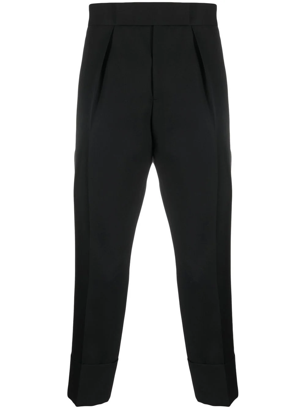 pleated cropped trousers black wool/cotton pleat detailing concealed front fastening turn-up cuffs cropped leg two side slit pockets adjustable strap to the rear two rear flap pockets Made in Italy Composition Outer: Wool 100% Lining: Cupro 100%, Cotton 100% SIZE & FIT Model measurements Height 6 ft 2 in(1.89 m) Bust/Chest 35.03 in(89 cm) Hips 38.18 in(97 cm) Waist 29.92 in(76 cm) FittingInformation This piece fits true to size. We recommend you get your regular size Cut for a slim fit Made with a mid-weight non-stretch fabric Washing instructions Dry Clean Only