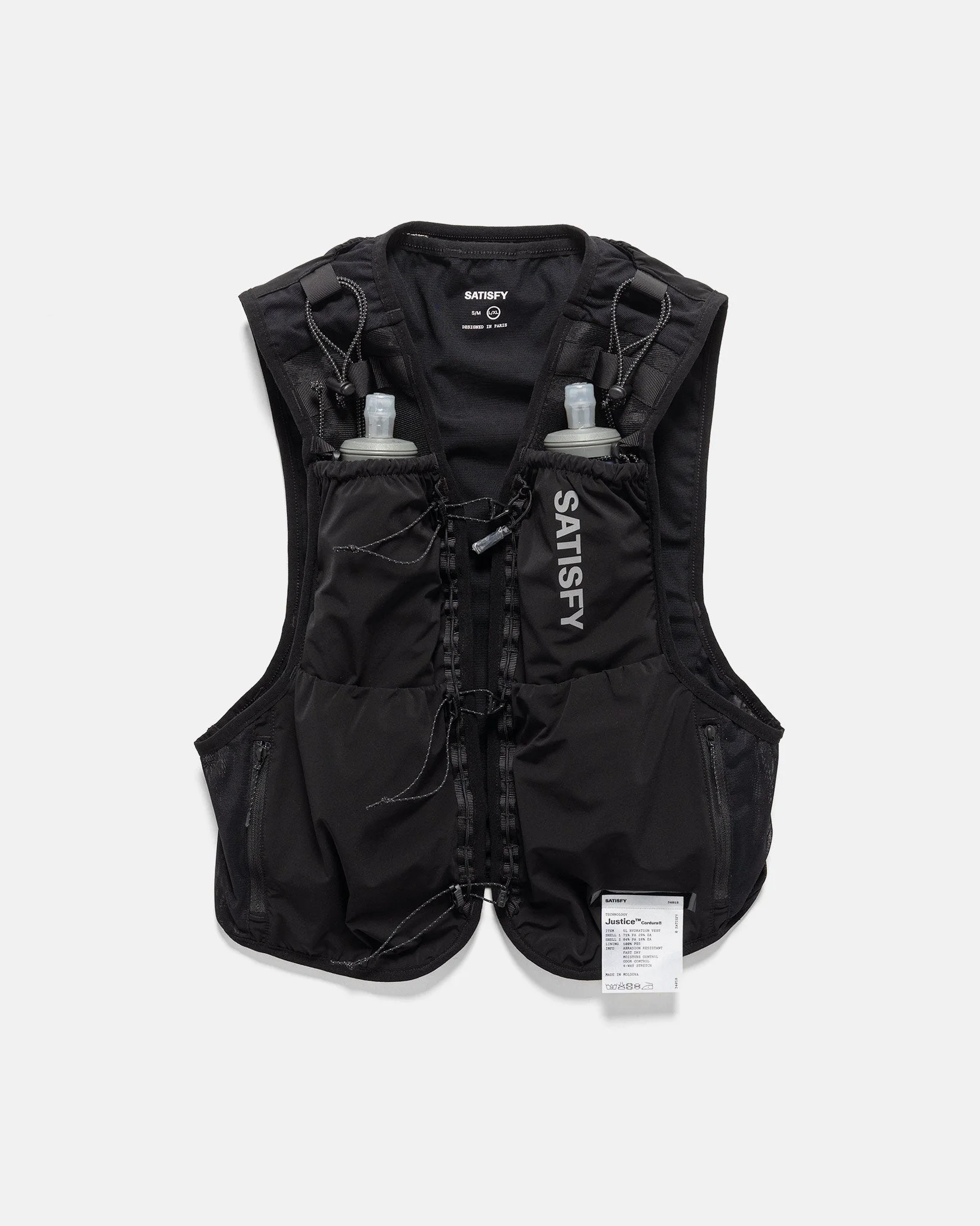 The SATISFY Justice™ Cordura® Hydration Vest 5L is an ultra-lightweight, high-performance running vest engineered for long-distance endurance. Constructed from Justice™ technical silk and reinforced with Cordura®, it delivers exceptional breathability, durability, and 4-way stretch for unrestricted movement. Designed with a versatile 8-pocket system, it also includes two 500ml HydraPak® soft flasks and an emergency whistle for added safety. DETAILS - 34018-BK-SA - Shell: 70% nylon, 30% elastane - Lining: 84% nylon, 16% elastane - 3D Mesh Lining: 100% polyester - Adjustable fit - 8-pocket system - 5L storage capacity - 2x 500ml HydraPak® soft flasks - Emergency whistle - Detachable exterior care label