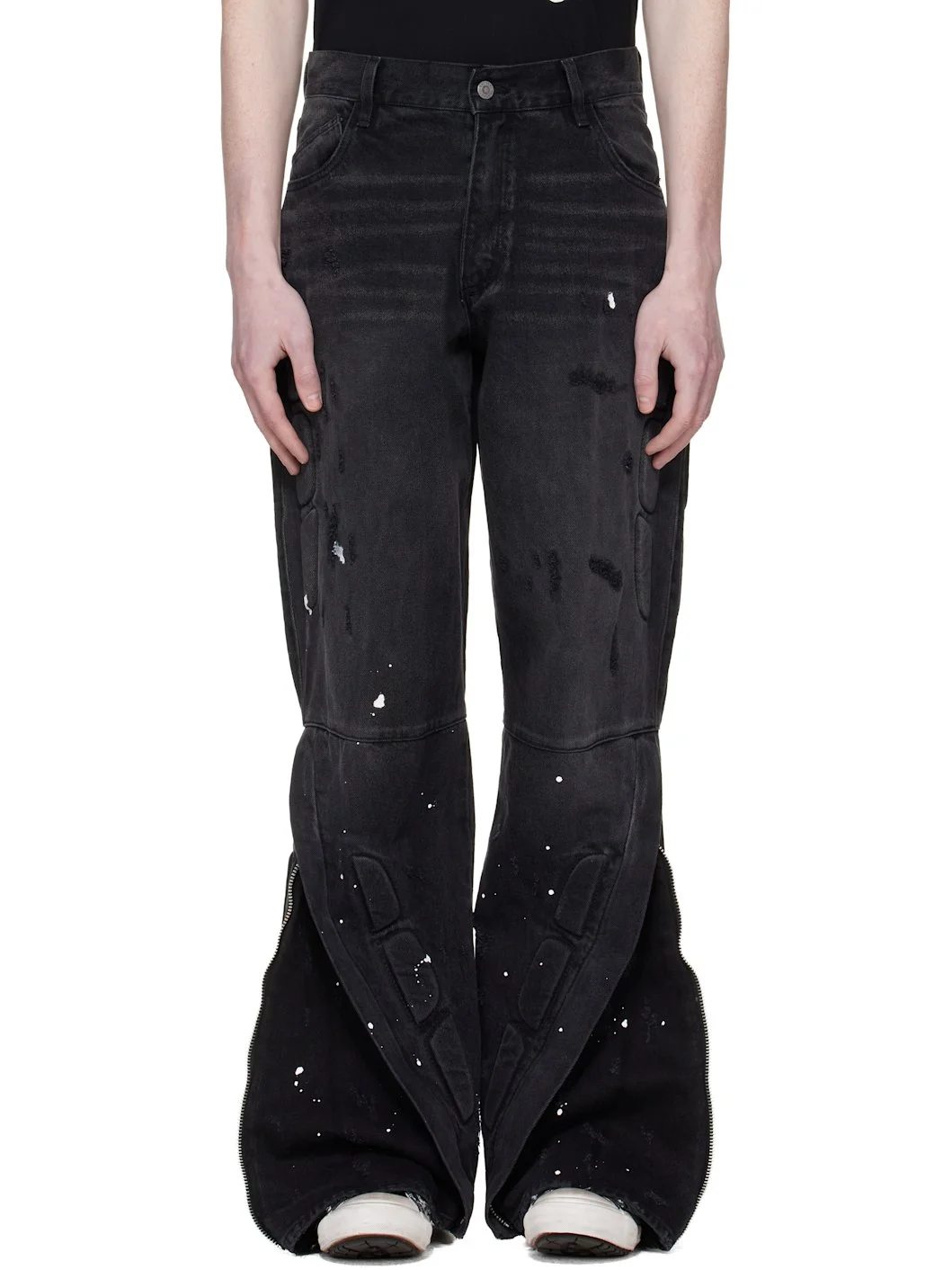 Non-stretch denim jeans. · Fading, whiskering, distressing, and paint splatter throughout · Five-pocket styling · Zip fly · Zip expansion panel at cuffs · Padded appliques at outseams Supplier color: Black 100% cotton. Made in United States 252116M186001