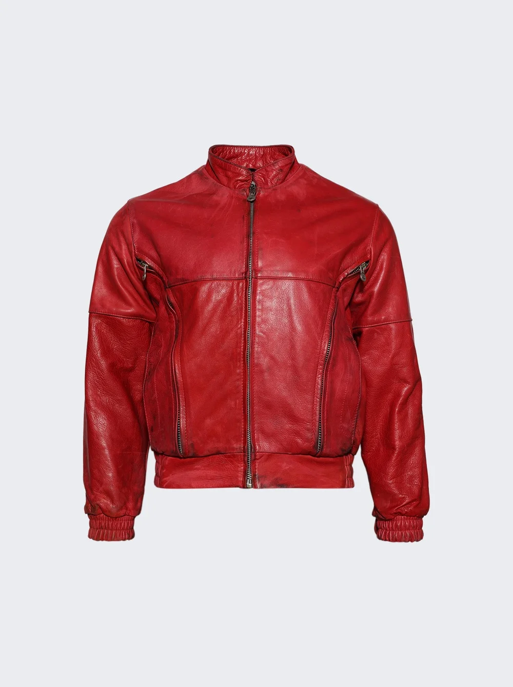 Details - Red leather bomber jacket - Intentional markings for a worn-in look - Zipper detailing on the front, back, and sleeves - Metal plaque on the back collar - Material: 100% Calf leather Vendor Color Code: Brand Style: FW25JKT006-RED Designer/Brand: SATOSHI NAKAMOTO
