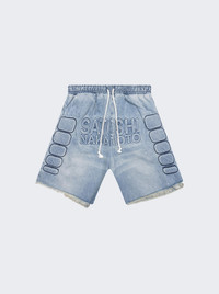 Details - Relaxed-fit denim shorts - Elastic waistband with drawstring - Moto-inspired padded details - Two side pockets, one back pocket - Raw hem - Material: 100% Cotton; Padding: 100% Polyethylene Vendor Color Code: Brand Style: FW25SRT001-BLU Designer/Brand: SATOSHI NAKAMOTO
