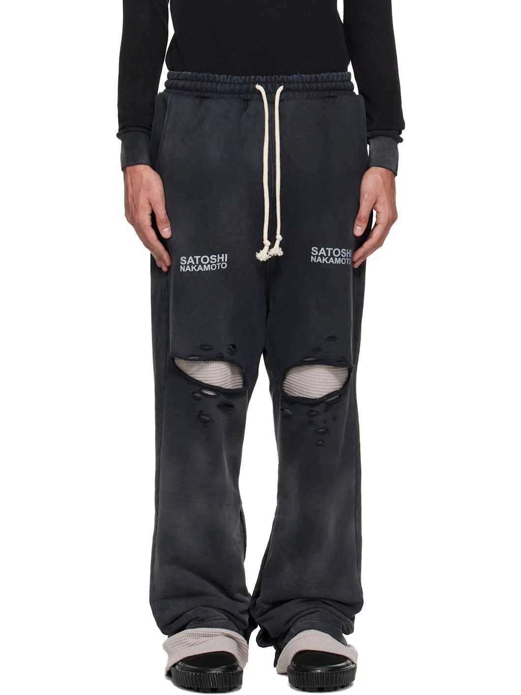 Cotton fleece sweatpants. · Fading and distressing throughout · Drawstring at elasticized waistband · Three-pocket styling · Logo printed at front · Cutout at knees · Press-stud vent at cuffs · Full waffle-knit lining Supplier color: Washed black 100% cotton. Made in United States 252116M190004