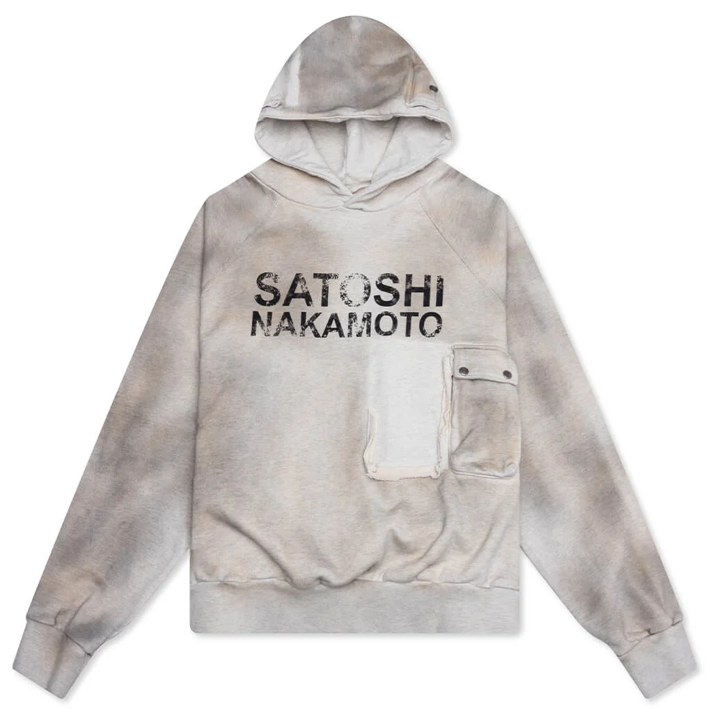 The Satoshi Cargo Hoodie from Satoshi Nakamoto is made from heavyweight cotton. Designed with an oversized fit, this hoodie features a fixed hood, ribbed trims, and cargo pockets scattered throughout. The logo is stamped across the front, while a dirty wash treatment with intentional stains adds to the signature Satoshi Nakamoto aesthetic. THIS PRODUCT DOES NOT QUALIFY FOR ANY DISCOUNTS OR SPECIAL PROMOTIONS. EXCLUDED FROM END OF YEAR SALE. - 100% Cotton - Heavyweight - Oversized fit - Fixed hood - Raglan sleeves - Screen-printed branding - Cargo pockets - Ribbed trims - Dirty wash with intentional stains - Style No: FW25HO004-WHT