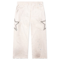 The Star Studded Sweatpant from Satoshi Nakamoto is made from 100% heavyweight cotton. Designed with an oversized elastic waistband and internal drawcords for a relaxed fit, they feature side-seam pockets and a rear pocket. Intentional stains, paint splatters, and raw, distressed hems give it a deconstructed, lived-in look. Two large studded stars sit on each leg, while a small embroidered 'Satoshi' completes the piece. - 100% Cotton - Heavyweight - Intentional stains & paint splatters - Oversized elastic waistband with internal drawcords - Aluminum studs - Embroidered branding - Raw hem with distressing - Side-seam pockets - Distressed rear pocket - Style no: SS25SWP001-WHT