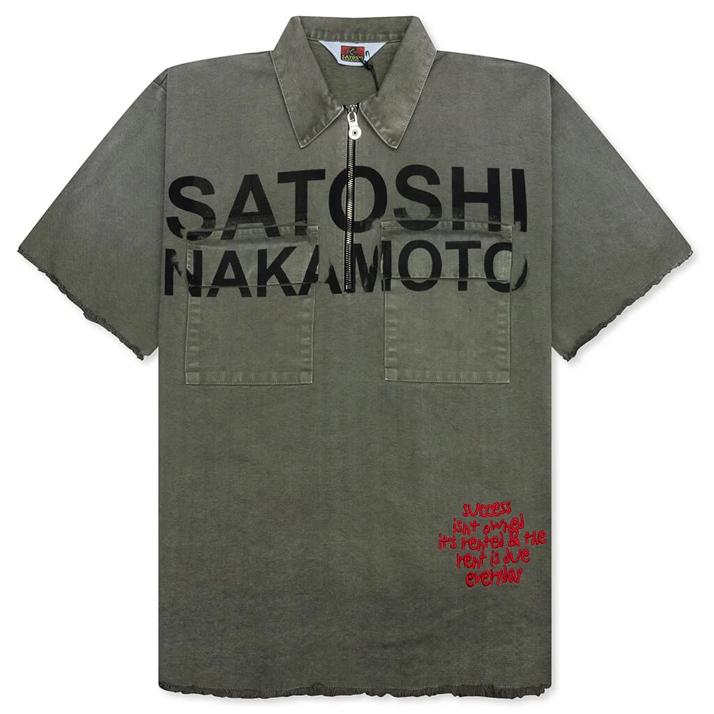 The Success Isn't Owned Mechanic Shirt from Satoshi Nakamoto blends structured tailoring with workwear. Made from cotton, this polo is designed to have a relaxed, boxy silhouette. A Satoshi Nakamoto logo is stamped across the front and accented with contrast embroidered graphics. Other features include a point collar, half-zip closure, chest pockets, and frayed hems. THIS PRODUCT DOES NOT QUALIFY FOR ANY DISCOUNTS OR SPECIAL PROMOTIONS. EXCLUDED FROM END OF YEAR SALE. - 100% Cotton - Relaxed, boxy fit - Point collar - Half-zip closure - Chest pockets - Screen-printed branding - Embroidered graphics - Frayed hems - Style No: FW25SHT004-OLV