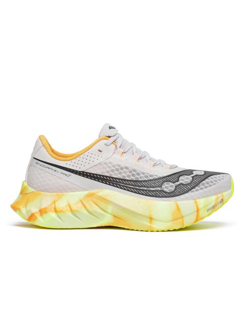 The Endorphin Pro 4 running shoe is a miraculous feat of engineering: snappy and responsive yet smooth and efficient. Something we achieved by fusing PWRRUN PB and PWRRUN HG together in the midsole – an industry first. A full carbon plate adds longitudinal stiffness and maximum metabolic efficiency. And the silky-smooth heel liner and integrated tongue system makes this marathon shoe feel like slipping on an old friend come race day. Made for Everyday Training/ Speed Training SUPPORT: Neutral CUSHIONING: PWRRUN HG PWRRUN PB WEIGHT: Men: 7.5oz (212g) Women: 6.5oz (185g) OFFSET: 8mm (39.5mm/31.5mm) Highlights - Carbon plate is engineered for longitudinal stiffness and maximum metabolic efficiency. - Snappy SPEEDROLL technology - effortless speed and propusive forward motion. - Race-ready fit - Silky smooth heel liner and integrated tongue for a connected comfort. FEATURES & BENEFITS - Snappy SPEEDROLL technology – effortless speed and propusive forward motion - Carbon plate – maximum and energy return and instant turnover - Silky smooth heel liner and integrated tongue for a connected, comfortable fit - Best for: Race Run - Heel-to-toe Offset: 8mm (39.5/31.5mm forefoot) - Weight: 7.5oz (212g) - Sustainability: This style is vegan and contains recycled materials