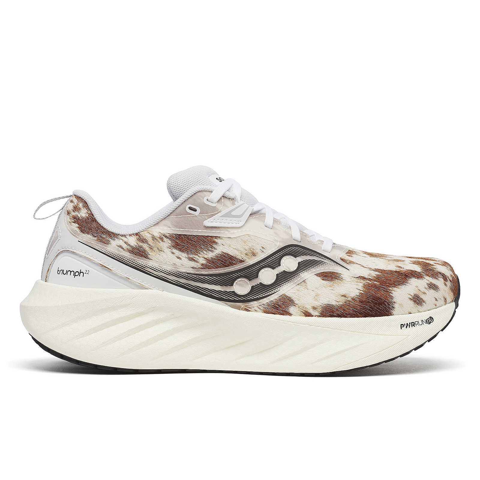 Experience the Triumph 22 Brindle, a limited-edition collaboration with Alex Dymond. This unique shoe fuses rugged Western heritage with modern running technology, combining luxury materials and cutting-edge comfort in a sleek, brindle-colored design. FEATURES & BENEFITS - Brindle hairs on suede upper - Moisture wicking tongue and lining - PWRRUN PB foam cushioning that strikes that ‘just right’ feeling – firm enough to propel, soft enough to cushion - Responsive ride and neutral feel. Built for runners who want a smooth, natural run without compromising on energy return - Best for: Daily run/ Workout/ Casual movement - Heel-to-toe Offset: 10mm (37mm heel / 27mm forefoot) - Weight: 10.1oz (286g) - Sustainability: This style is vegan and contains recycled materials