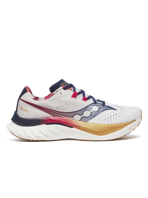 Experience the magic of New York City with every step. Inspired by the breathtaking skyline at sunrise, this limited edition Endorphin Speed 4 marathon colorway captures the essence of the city that never sleeps. FEATURES & BENEFITS - Smooth SPEEDROLL technology for effortless speed, smooth turnover and propulsive forward motion - PWRRUN PB foam is a true unicorn, offering the best combination of cushioning and energy return of any foam on the market. Striking that 'just right' feeling – firm enough to propel, soft enough to cushion - Re-engineered winged nylon plate for vertical reinforcement while maintaining flexibility through the forefoot - Best for: Race Run/Speed Run - Heel-to-toe Offset: 8mm (36/28mm forefoot) - Weight: 8.2oz (233g) - Sustainability: This style is vegan and contains recycled materials