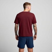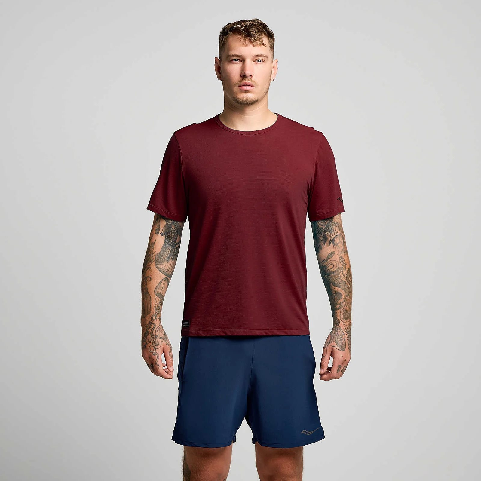 Redesigned for incredible breathability and optimal stretch. FEATURES & BENEFITS - Dialed in fit and function - Best-in-class sweat-wicking - Now with superior 4-way stretch material - Flat lock seams - Made of 92% Recycled Polyester - Best for: Daily runs or workouts - Active fit - Primary material: 140 g/m2 92% Polyester (Recycled) / 8% Elastane - Shaped hem is ideal for layering whether tucked or untucked - Small internal locker loop for hanging to dry - Reflective logos and Saucony patch logo - Model is wearing a size medium