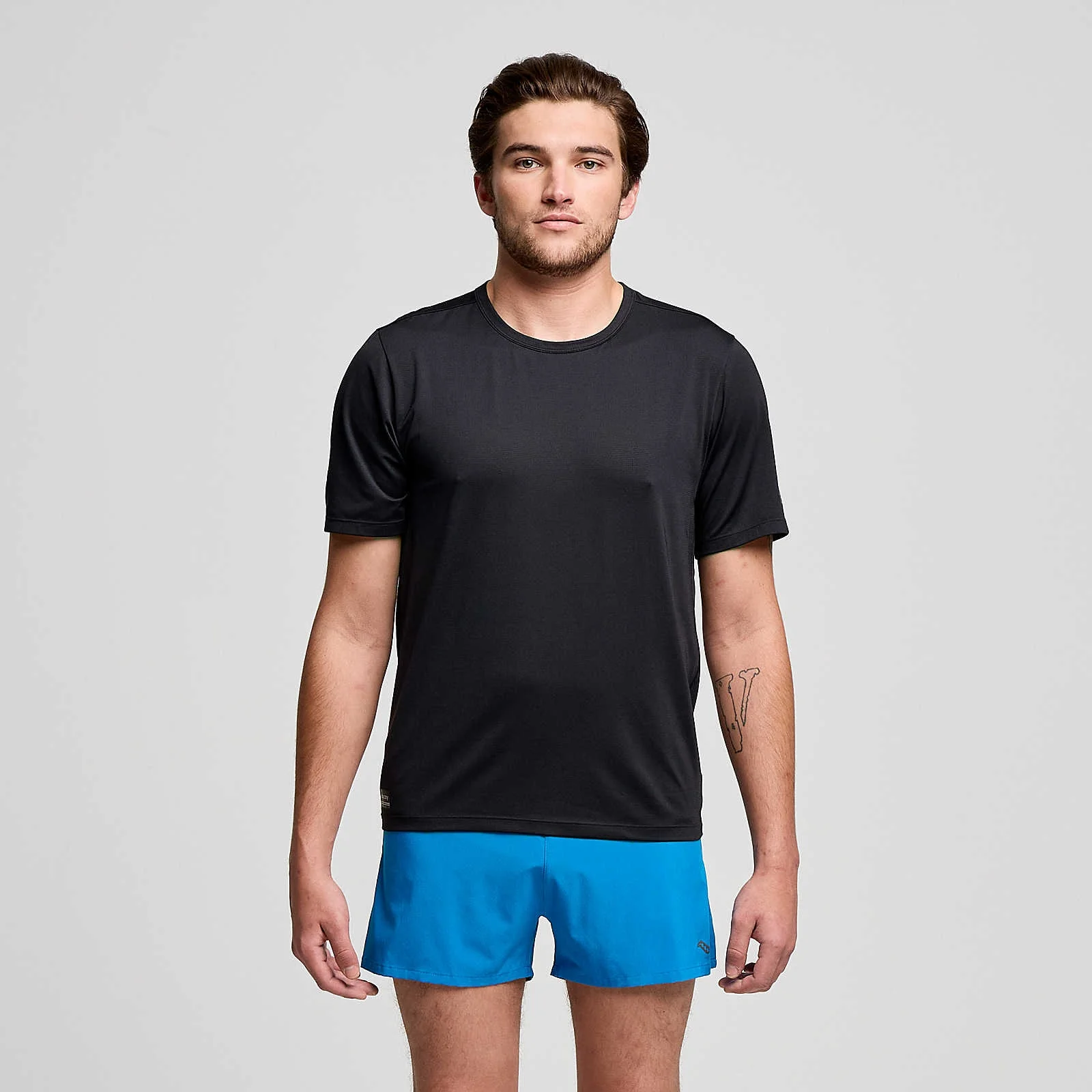 Redesigned for incredible breathability and optimal stretch. FEATURES & BENEFITS - Dialed in fit and function - Best-in-class sweat-wicking - Now with superior 4-way stretch material - Flat lock seams - Made of 92% Recycled Polyester - Best for: Daily runs or workouts - Active fit - Primary material: 140 g/m2 92% Polyester (Recycled) / 8% Elastane - Shaped hem is ideal for layering whether tucked or untucked - Small internal locker loop for hanging to dry - Reflective logos and Saucony patch logo - Model is wearing a size medium