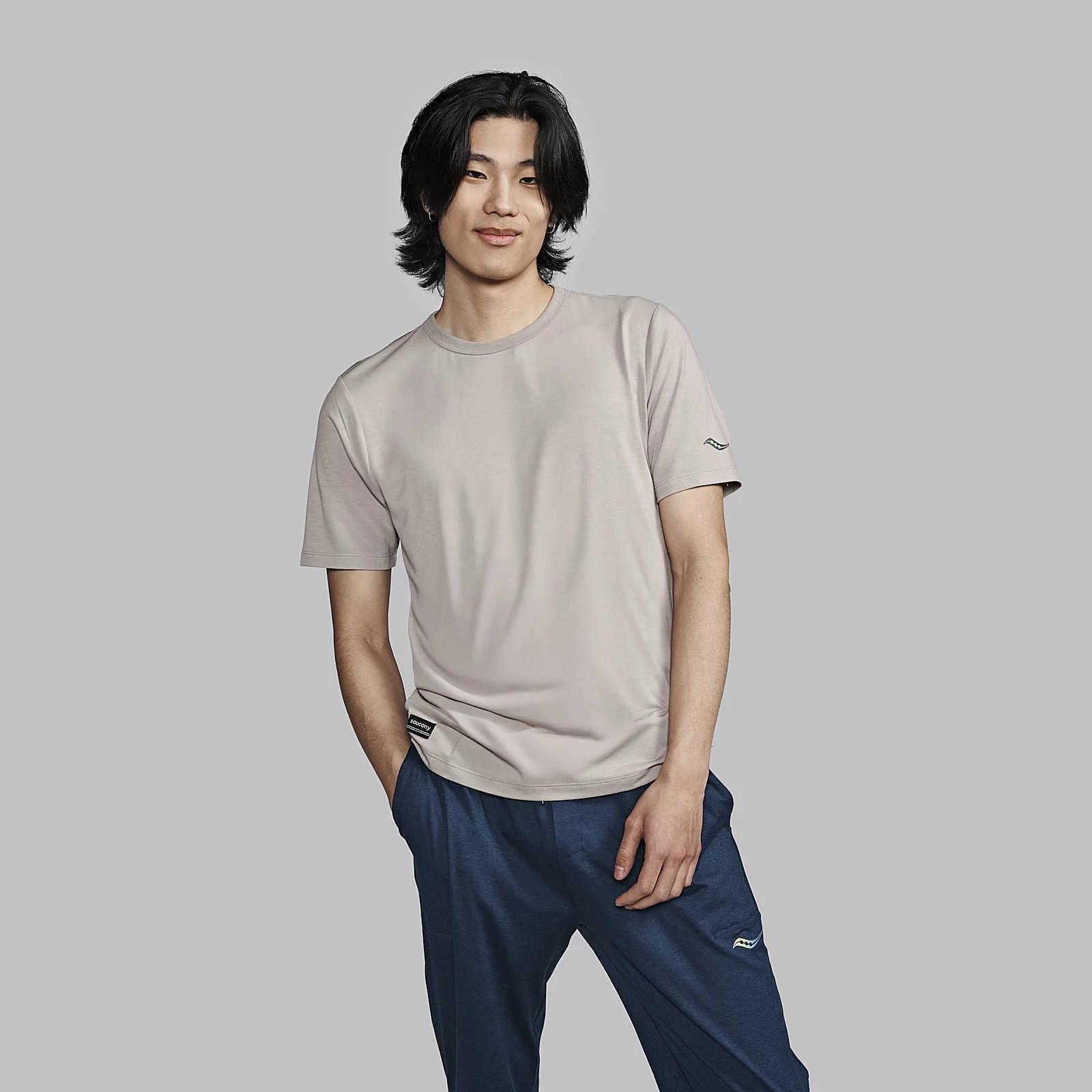 Luxurious comfort that stretches the meaning of active wear. FEATURES & BENEFITS - Fabric fluidly flows with you - drirelease® E.C.O dries you up 4x faster than cotton - Buttery-soft hand feel - Responsibly made - Luxurious stretch knit - 30+ UPF rating - Best for: Active, all-day - Active fit - Primary material: 185g/m2 82% Polyester (Recycled)/ 11% Lyocell / 7% Elastane - Reflective logo and Saucony logo patch - Model is wearing a size medium