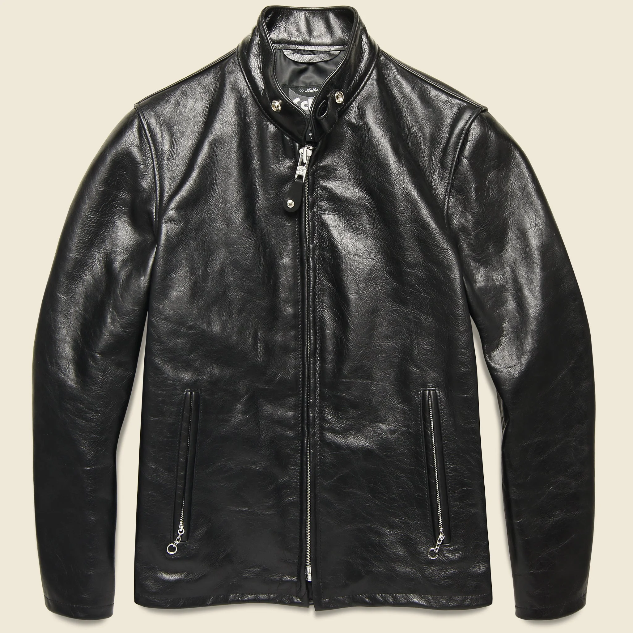 Schott NYC’s slim-fitting Leather Casual Racer Motorcycle Jacket gives a tip of the hat to 1950s iconic jackets worn by English soldiers back from WWII. Schott remodeled the classic Perfecto motorcycle jacket with a minimalist contour in mind, adding a mandarin-style upright collar and designing the arms to fit tightly from shoulder to zippered cuffs. The result is a no-frills, refined look that you can take to the open road for a warm-weather ride or out for a night out. - Chrome tanned, drum dyed, lightweight cowhide leather - Medium to soft hand leather that has a bit of shine, no vintage treatment - Durable nickel-plated brass hardware - Cafe Racer style “mandarin” collar with snap closure - Custom embossed “SCHOTT” snap faces - Zippered sleeve cuffs - Two outside zippered pockets with chain pull - Leather-trimmed inside breast pocket - Non-insulated satin lining - 654 Made in USA Materials: 100% cowhide The following measurements are for size medium: Chest: 40" | Sleeve: 32" | Length: 26"