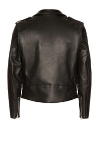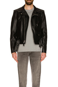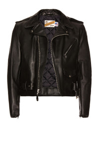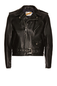 - Self: 100% cowhide leather Body Lining: 100% cotton Sleeve Lining: 100% poly - Made in USA - Professional leather cleaning only - Asymmetrical front zip closure Snap-down lapels - Attached half belt with nickel plated square buckle - Shoulder epaulettes with star accents and zipper closure at cuffs - Front zipper pockets - Interior welt pocket - Revolve Style No. SCHF-MO2 - Manufacturer Style No. 613