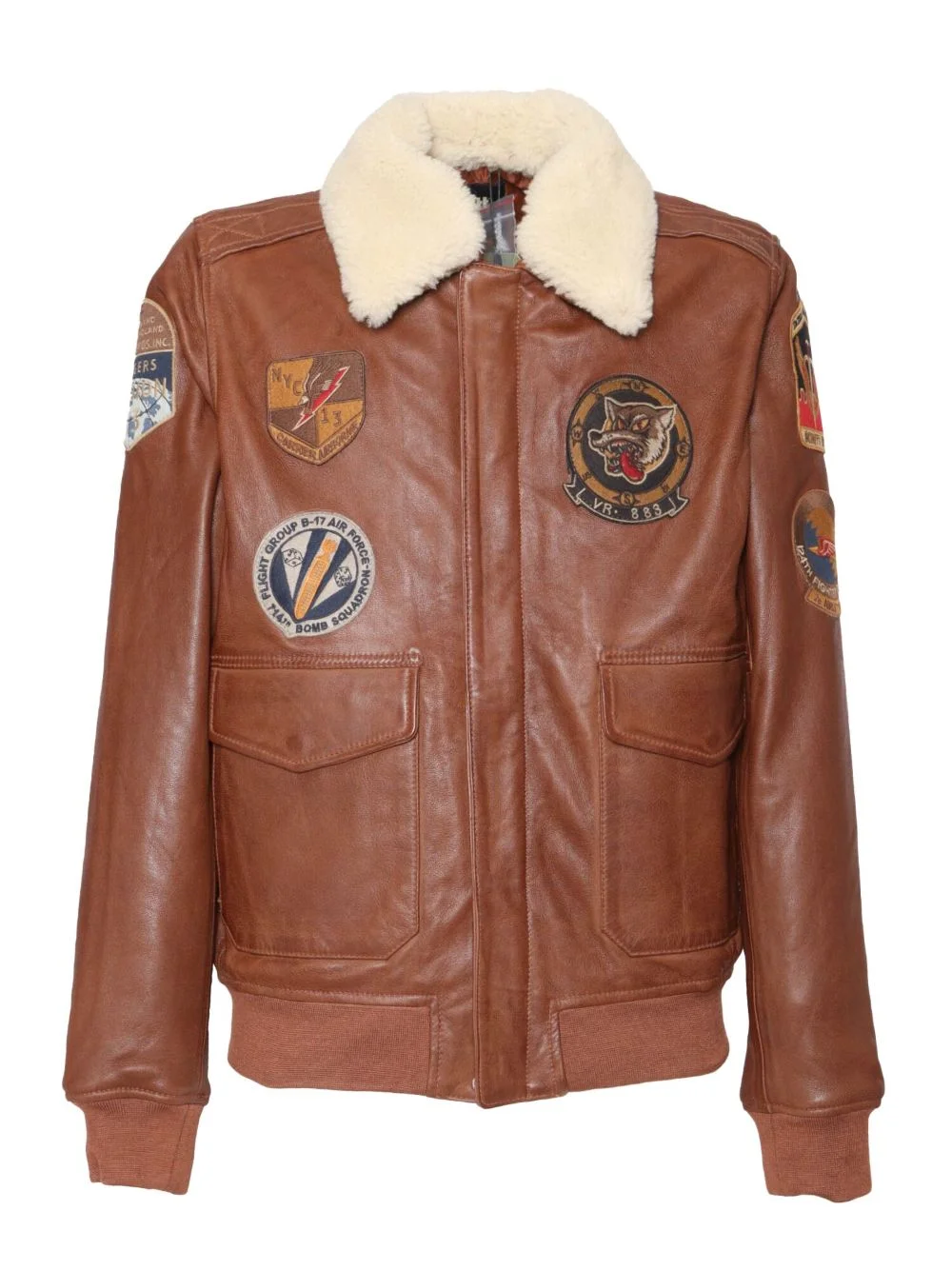 patch-detailed leather bomber jacket Highlights - Cognac brown - Patches detailing - Flap pockets Imported Composition Leather 100% Washing instructions Read Manufacturer Guidelines