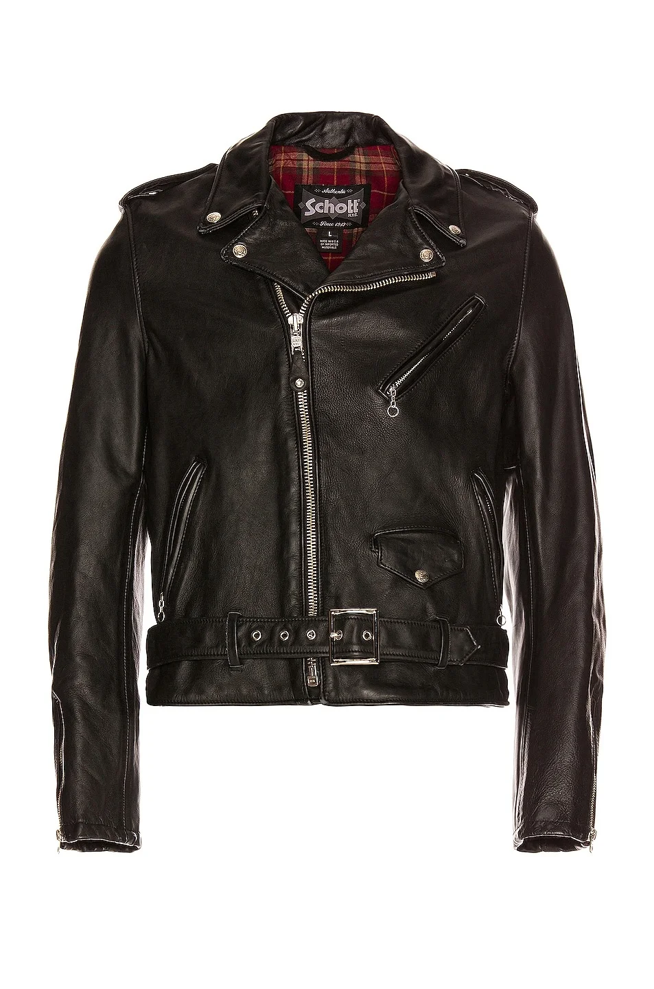 Details - Self: 100% cowhide leather - Lining: 100% cotton - Sleeve Lining: 100% poly - Made in USA - Professional leather cleaning only - Asymmetrical front zip closure - Snap-down collar - Attached half belt with nickel plated square buckle - Zip and flap front pockets - Epaulettes and zipper closure at sleeves - Interior welt pocket - Our Style No. SCHF-MO4 - Manufacturer Style No. 626VN