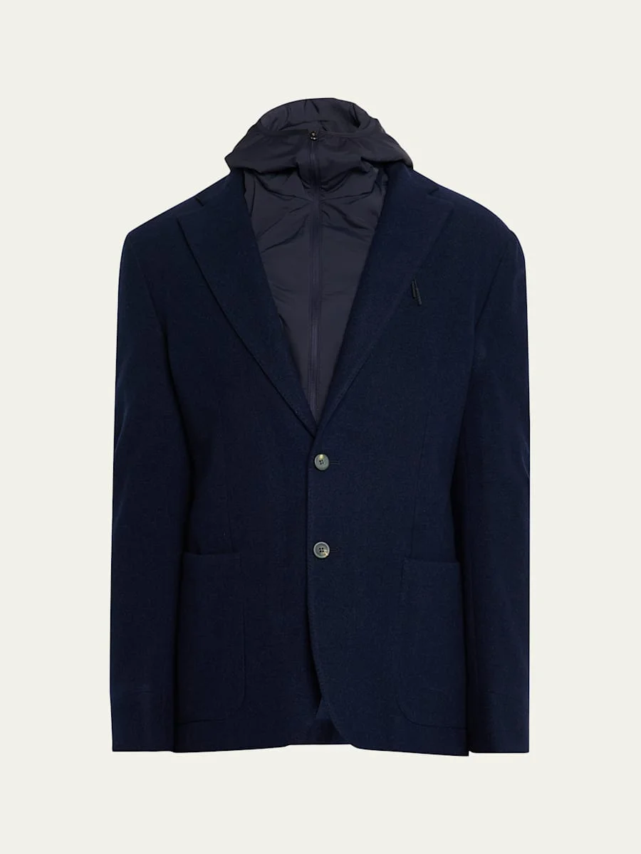 Merging tradition and functionality, the Sease unstructured blazer features a technical bib section and a detachable technical hood made of waterrepellent stretch nylon Hooded Long sleeves Two large patch pockets Cutaway hem Twobutton closure Virgin wool Polyester fill Made in Italy