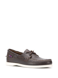 lace-detail boat shoes Dark-brown leather lace-detail boat shoes from Sebago featuring a lace detail, an exposed seam detail, a round toe, a flat heel, a branded insole and a white rubber sole. Imported Composition Outer: Calf Leather 100% Lining: Calf Leather 100% Sole: Rubber 100%