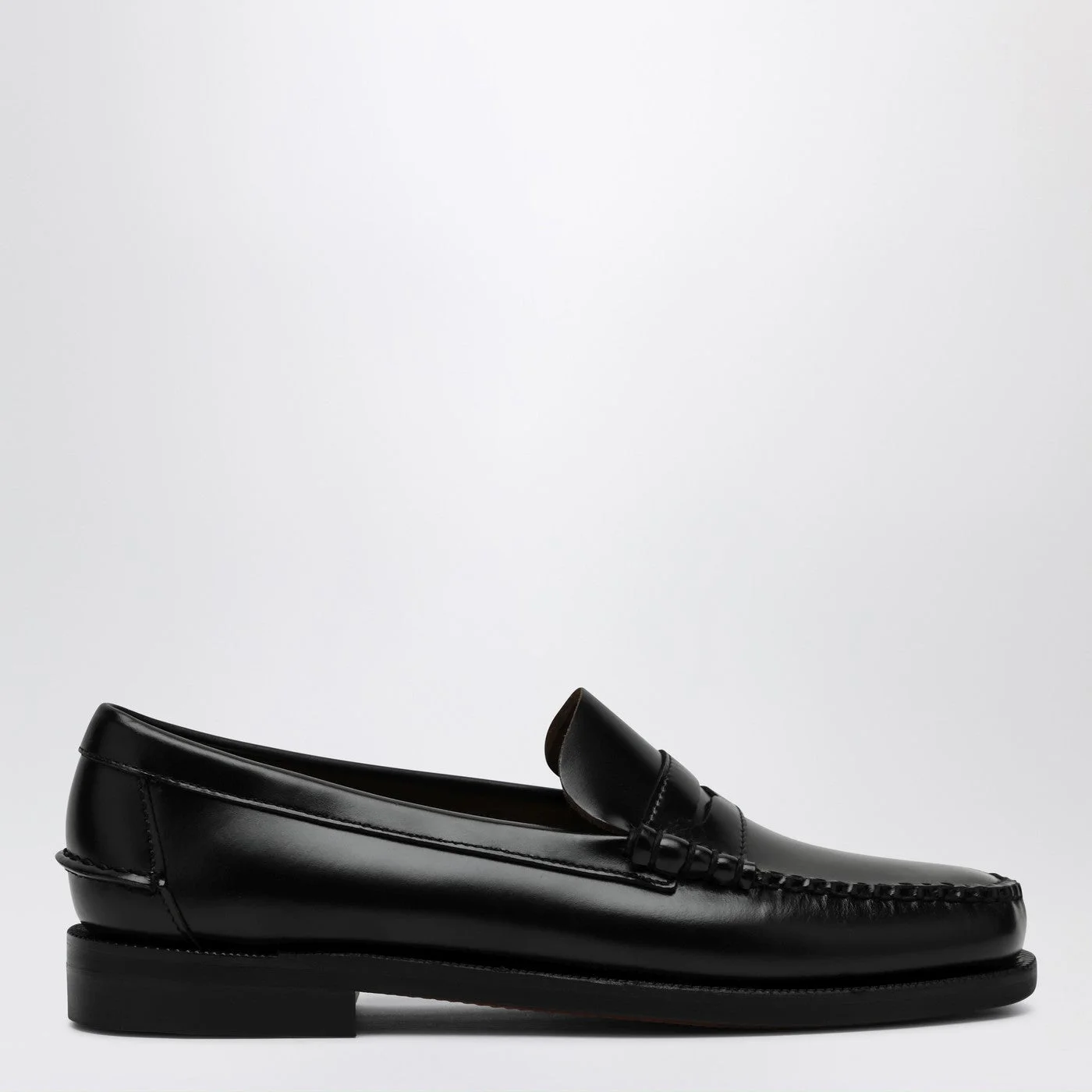 Classic Sebago moccasin in black leather characterized by a round toe tone-on-tone mask and leather sole.