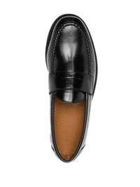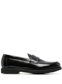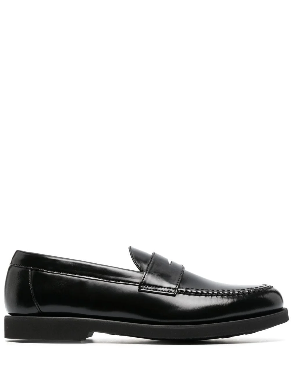 slip-on 24mm leather loafers jet black calf leather penny slot round toe low heel slip-on style Made in United Kingdom Composition Outer: Calf Leather 100% Lining: Calf Leather 100% Sole: Rubber 100% SIZE & FIT Measurement HEEL 0.98 in(2.5 cm) Sole height 0.39 in(1 cm)