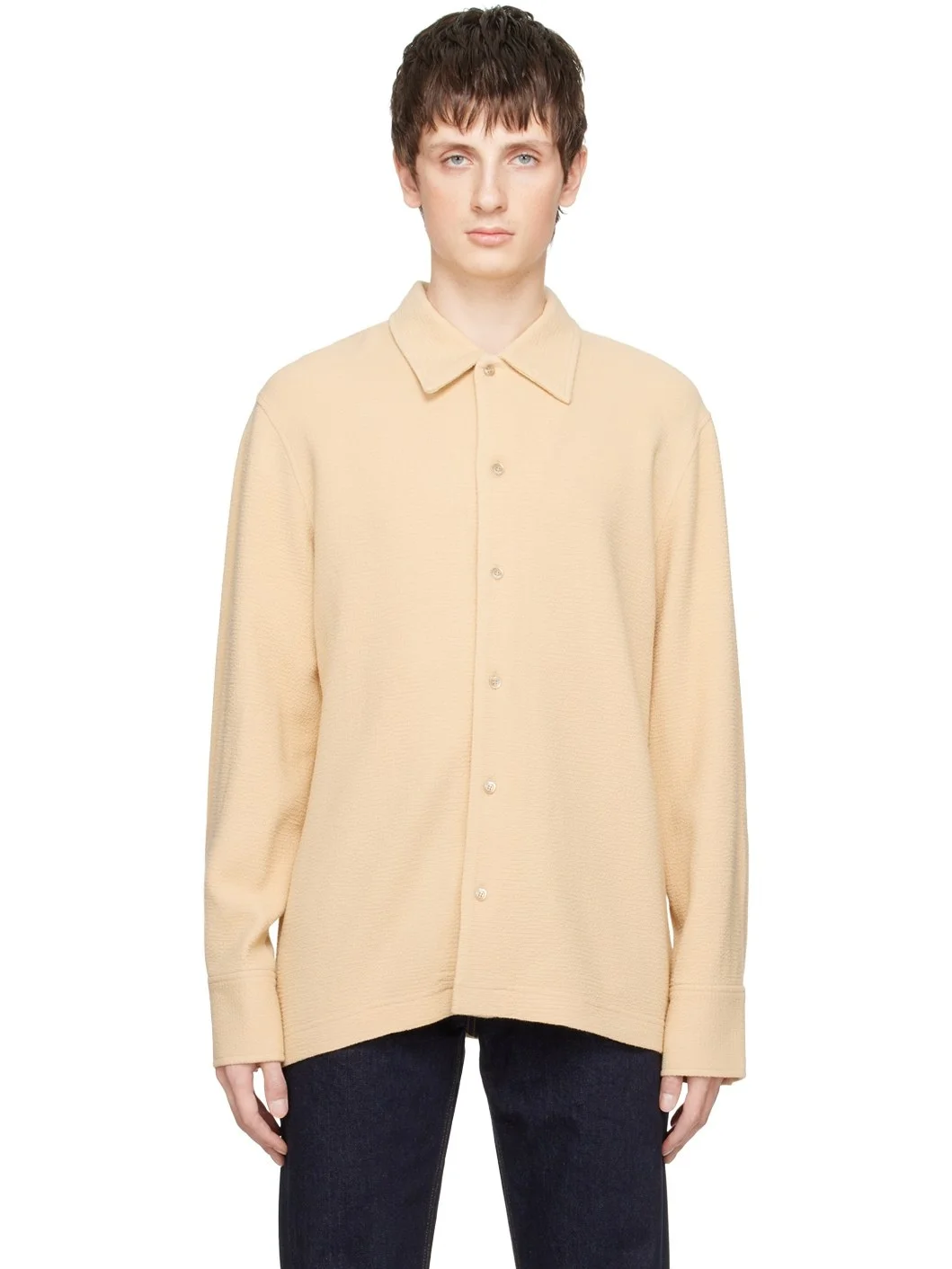 Stretch viscose and wool-blend seersucker shirt. · Spread collar · Button closure · Two-button barrel cuffs · Mother-of-pearl hardware Supplier color: Sand dune 58% viscose, 40% wool, 2% elastane. Made in Latvia 222491M192000