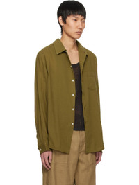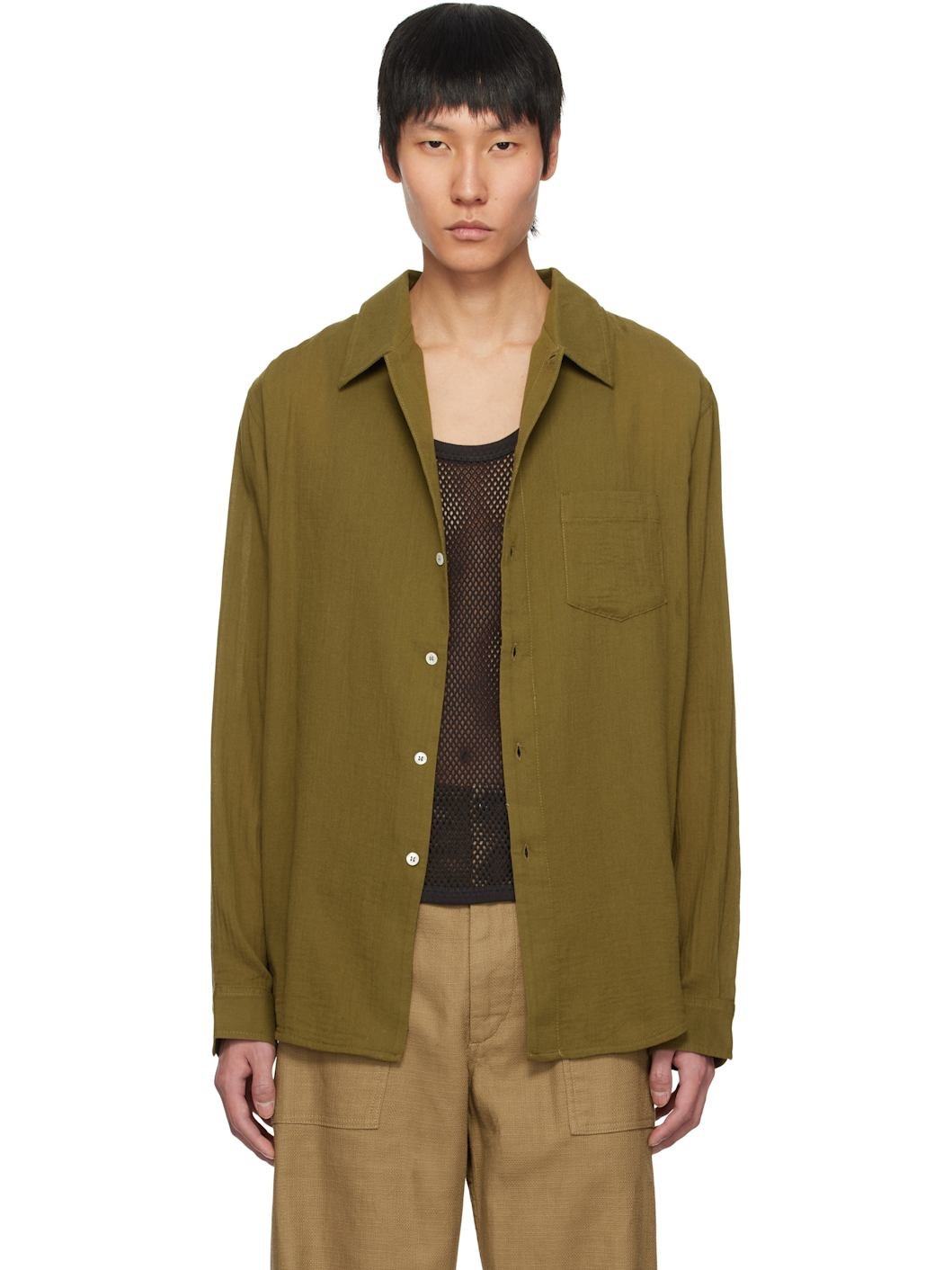 Lightweight cotton gauze shirt. · Open spread collar · Button closure · Patch pocket at chest · Shirttail hem · Dropped shoulders · Pleat at adjustable single-button barrel cuffs · Box pleat at back yoke · Mother-of-pearl hardware Supplier color: Moss green 100% cotton. Made in Latvia 251491M192020