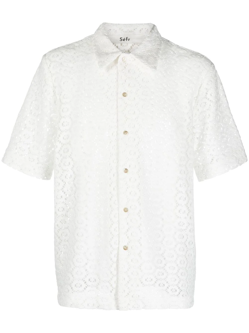 pointelle-knit shirt Highlights - White - Cotton blend - Pointelle knit - Pointed flat collar - Front button fastening - Short sleeves - Straight hem Imported Composition Cotton 85%, Polyamide 15% SIZE & FIT Model measurements Height 6 ft 0 in(1.84 m) Bust/Chest 36.22 in(92 cm) Hips 35.43 in(90 cm) Waist 26.77 in(68 cm) Measurement CHEST 40.94 in(104 cm) SLEEVE LENGTH 11.02 in(28 cm) Shoulder Width 17.32 in(44 cm) LENGTH 27.95 in(71 cm) WAIST 40.15 in(102 cm)