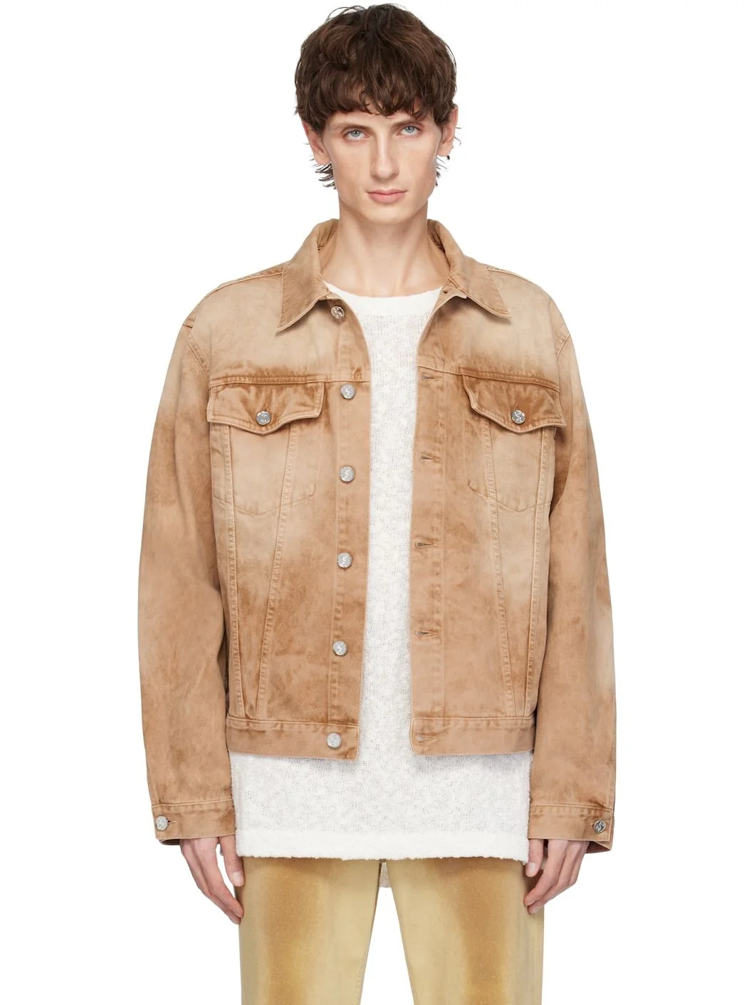 Washed 11.5 oz non-stretch denim jacket. Fading throughout. · Spread collar · Button closure · Flap pockets · Single-button barrel cuffs · Logo patch at back hem · Adjustable button tabs · Logo-engraved silver-tone hardware Supplier color: Faded cinnamon 100% cotton. Made in Italy 251491M177000