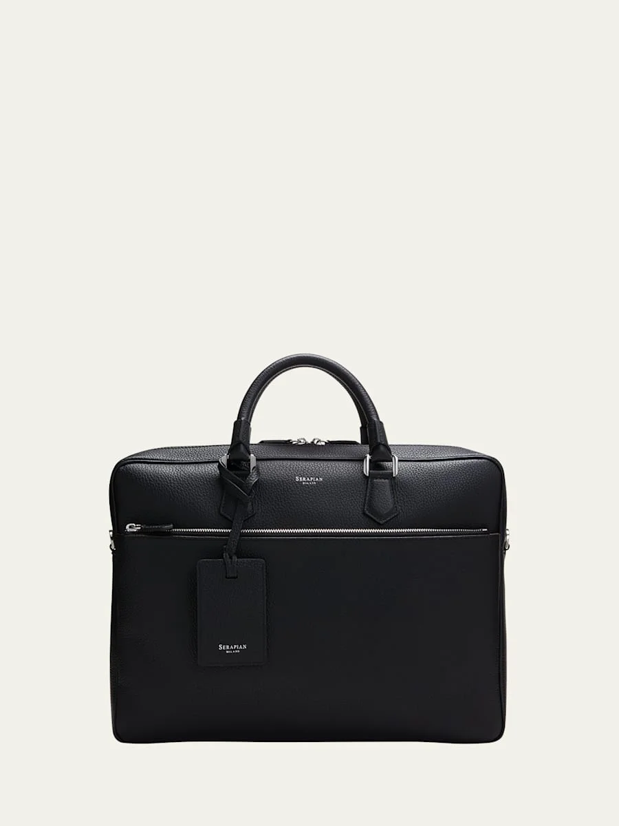 Serapian slim briefcase crafted from an exclusive soft naturally tumbled Cachemire calfskin leather Two-way zip closure Front zip pocket Two top carry handles Trolley sleeve on the back Interior padded laptop pocket; zip pocket; two slip pockets; four card slots; pen holder Customizable, detachable address tag Calf leather Made in Italy Online Inquiries: BGS21_NARRF| Store Inquiries: #4507313
