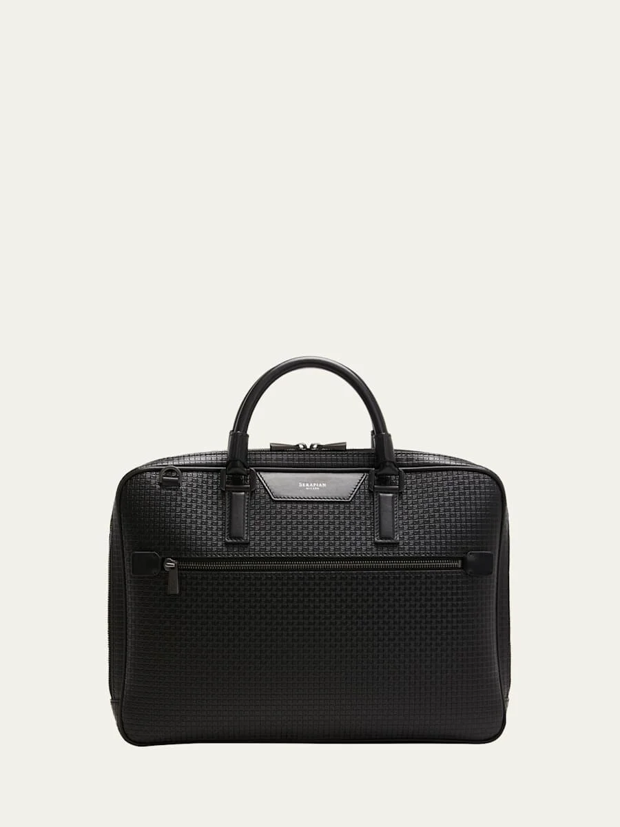 Serapian briefcase in Stepan coated canvas and calf leather Rolled top handles Shoulder strap attachments Twoway zip fastening Front zip pocket Trolley sleeve at back Interior: single compartment with padded laptop pocket, zip pocket, two phone pockets, four card slots and pen holder Approx. 10.6"H x 14.5"W x 2.0"D Made in Italy